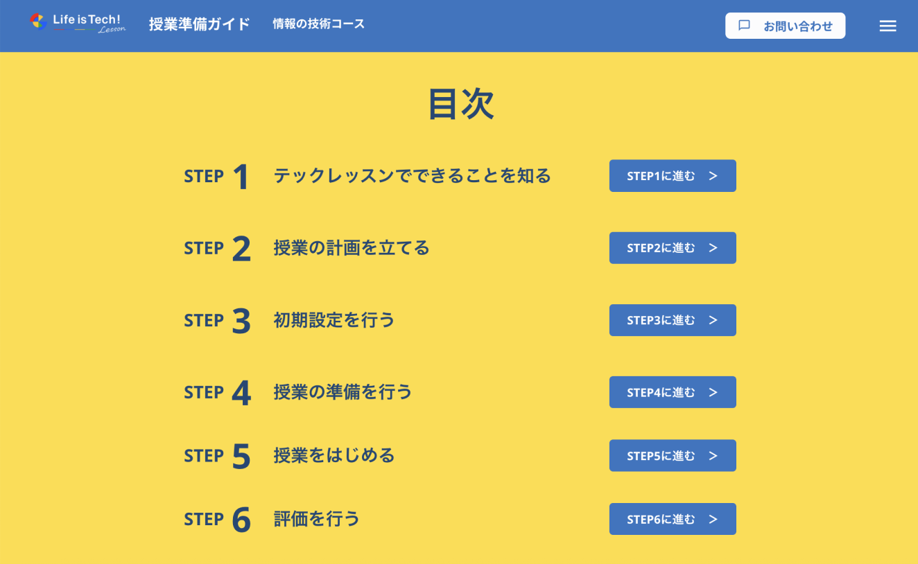 先生方の授業のサポートとして、授業準備の方法、実際の授業の進め方やオリジナルWebサイト制作の進め方を示した、授業準備ガイドをご用意しております。