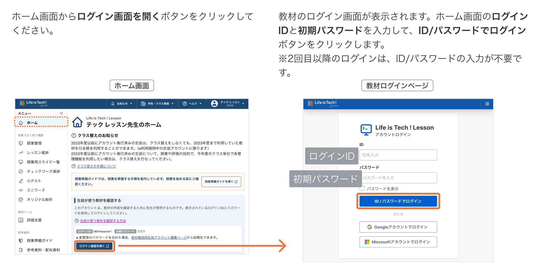 生徒が利用する教材を確認する 先生が生徒が利用する教材(レッスン)を確認する手順です。 目次1. 教員画面から生徒用教材のログインページを開く2. 任意のパスワードを設定する3. 生徒用教材を確認する 1. 教員画面から生徒用教材のログインページを開く 2. 任意のパスワードを設定する 3. 生徒用教材を確認する