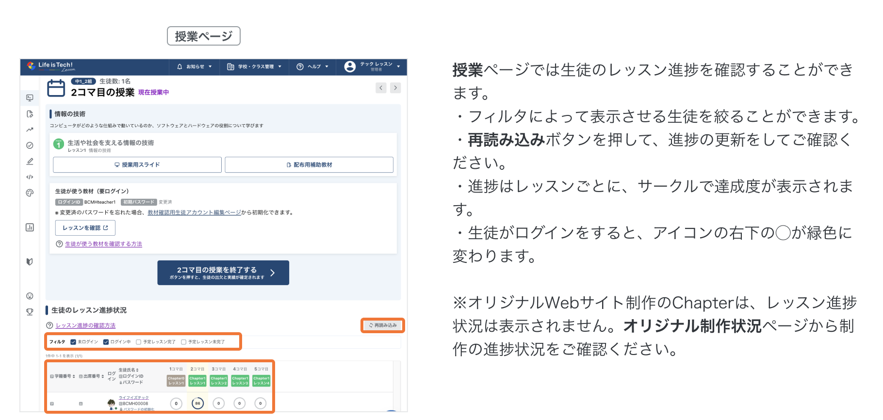 授業管理ページでの開始/終了の操作により、各コマの実施状況の管理や、生徒のレッスン進捗やログイン状態の確認などが可能になりますので、スムーズな授業進行にお役立てください。