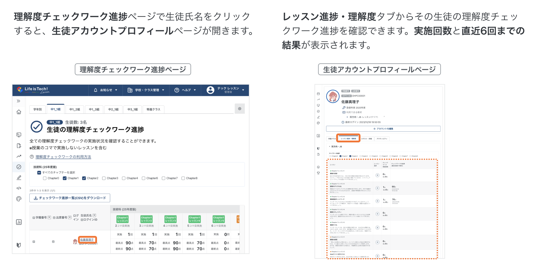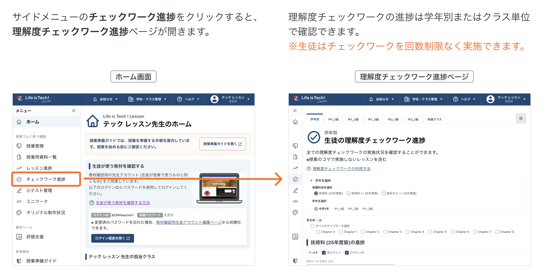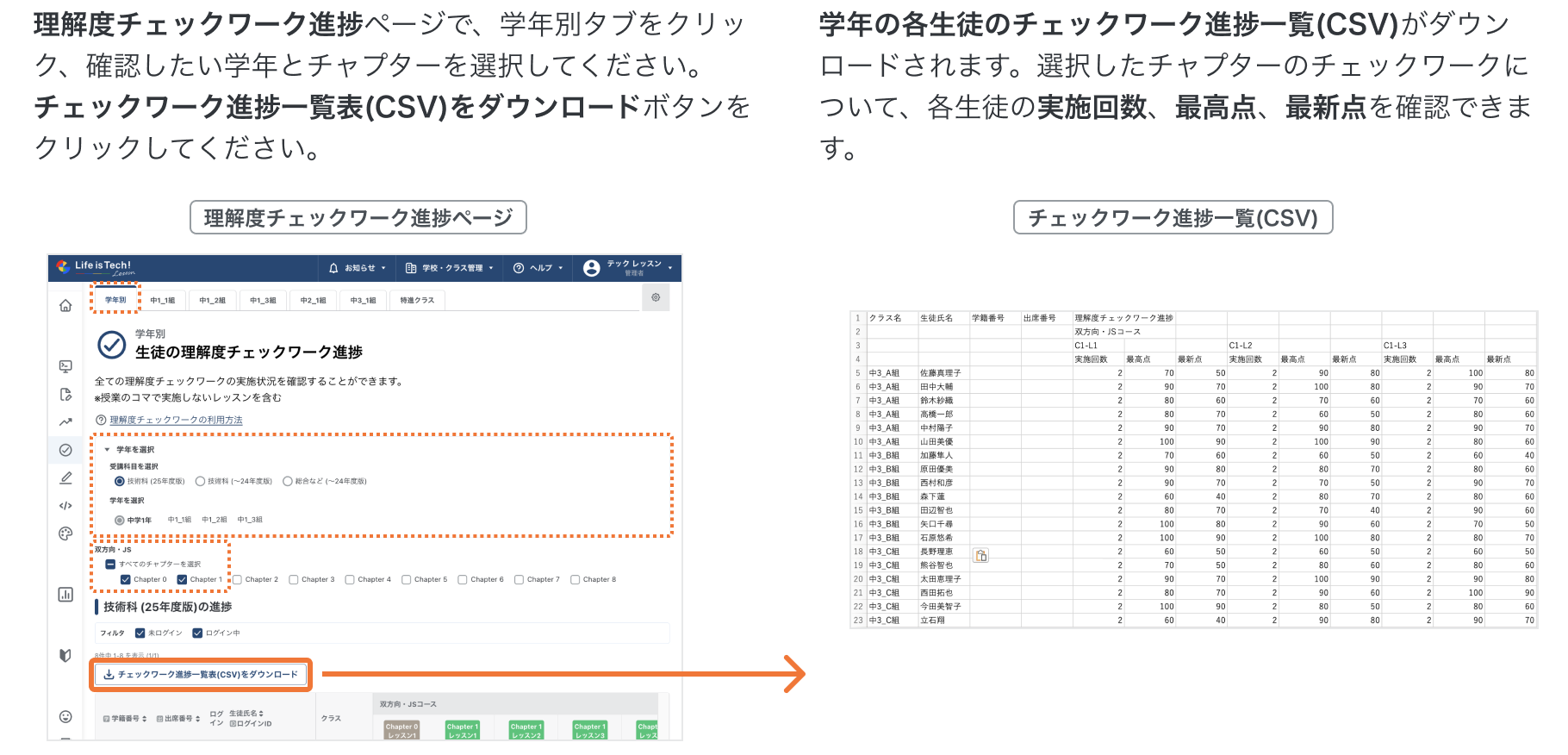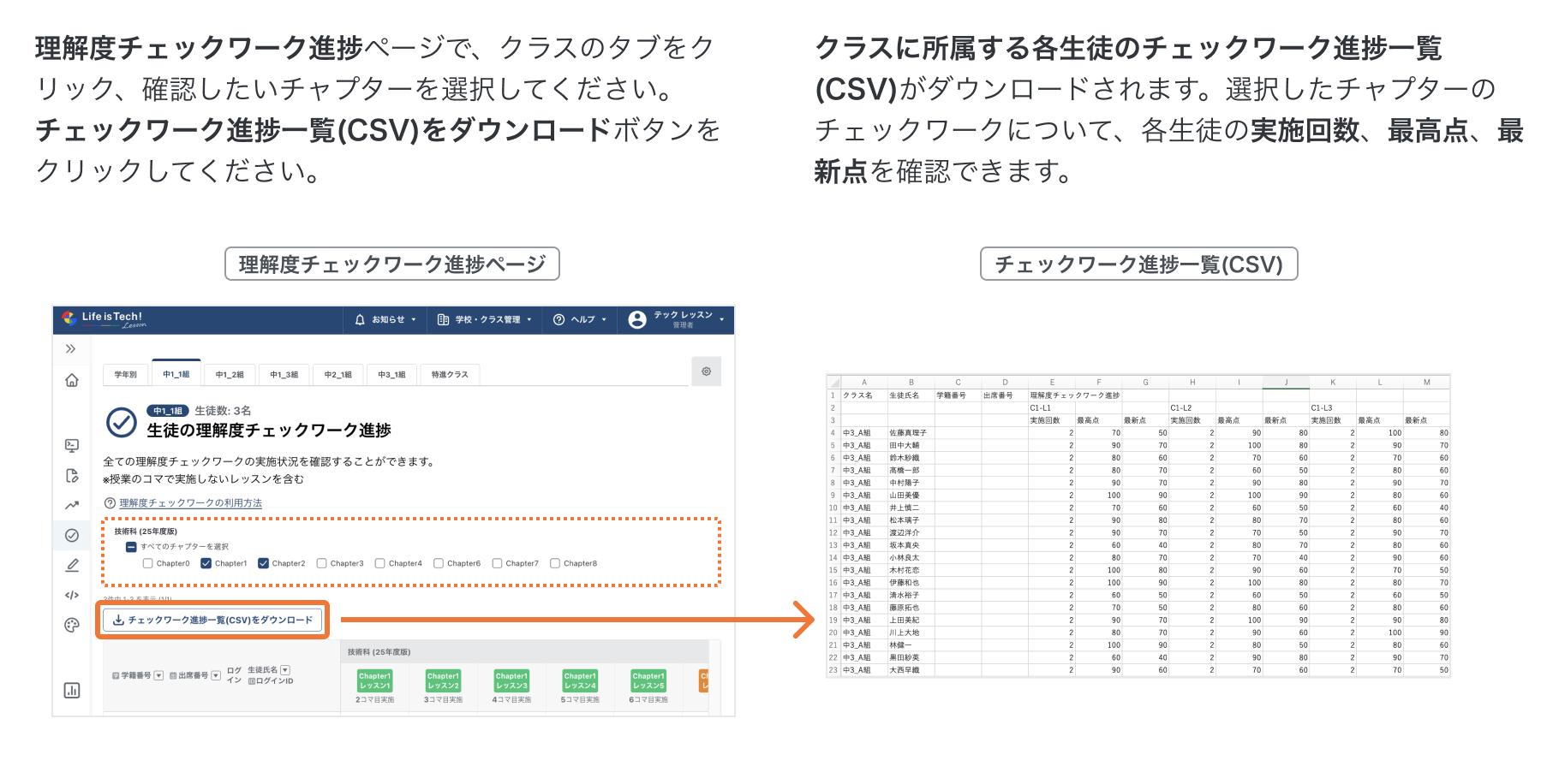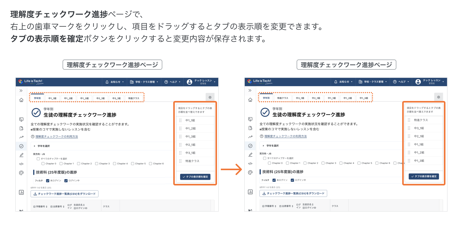 生徒の理解度チェックワーク進捗を確認する 生徒の理解度チェックワーク進捗を確認する手順です。 1. 理解度チェックワーク進捗ページから確認する 2. 学年別のチェックワーク進捗一覧(CSV)をダウンロードする 3. クラスのチェックワーク進捗一覧(CSV)をダウンロードする 4. 生徒アカウントプロフィールページから確認する 5. クラスのタブを並び替える その他の関連記事 生徒の並び順を変更することはできますか