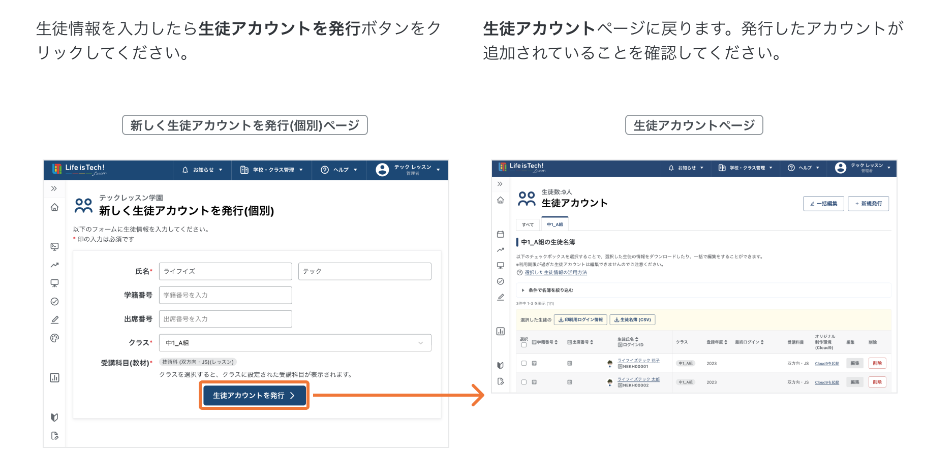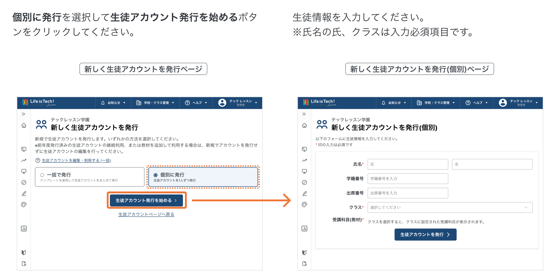 新しく生徒アカウントを発行する(個別)