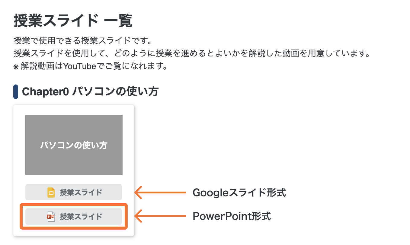 PowerPointのアイコンのついた 授業スライド ボタンをクリックすると、PowerPoint形式の授業スライドがダウンロードされます。