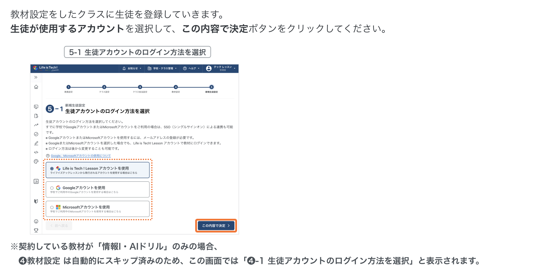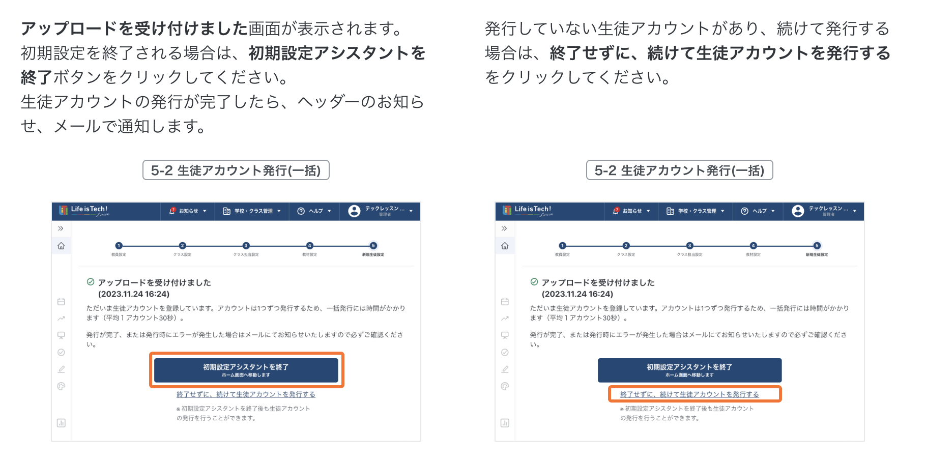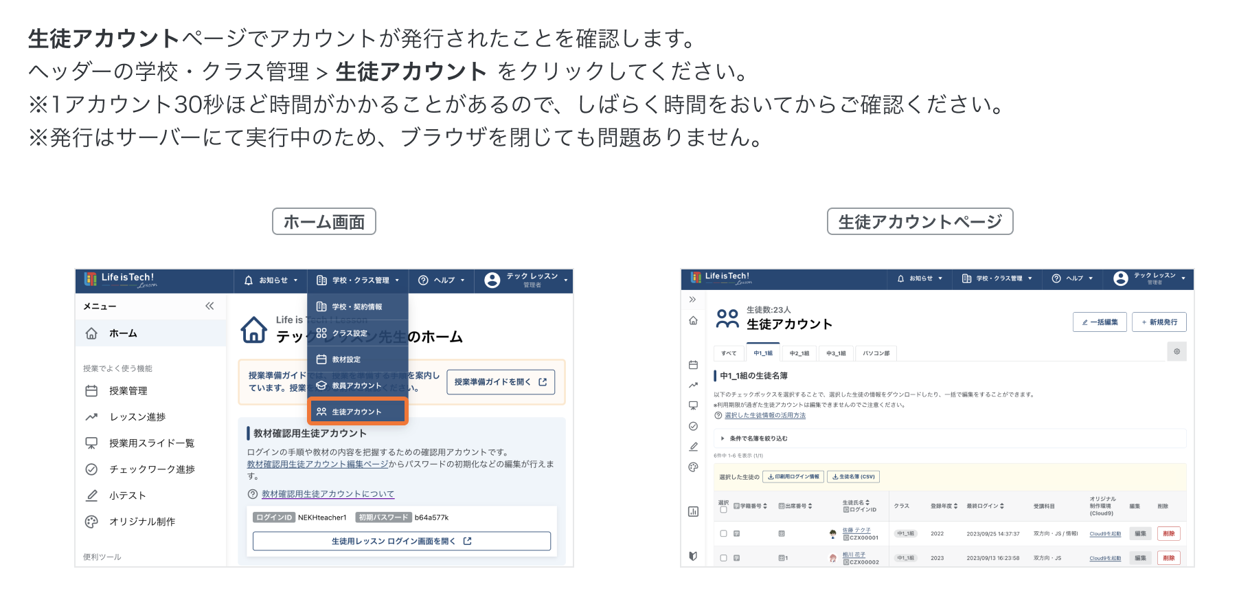 初期設定アシスタントで教材を設定したクラスに生徒アカウントを発行する手順です。
