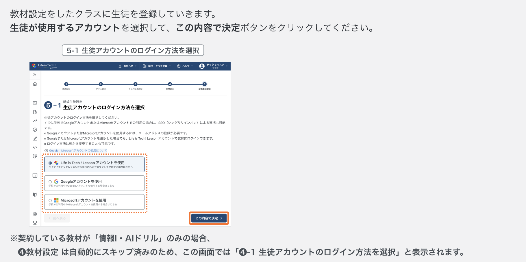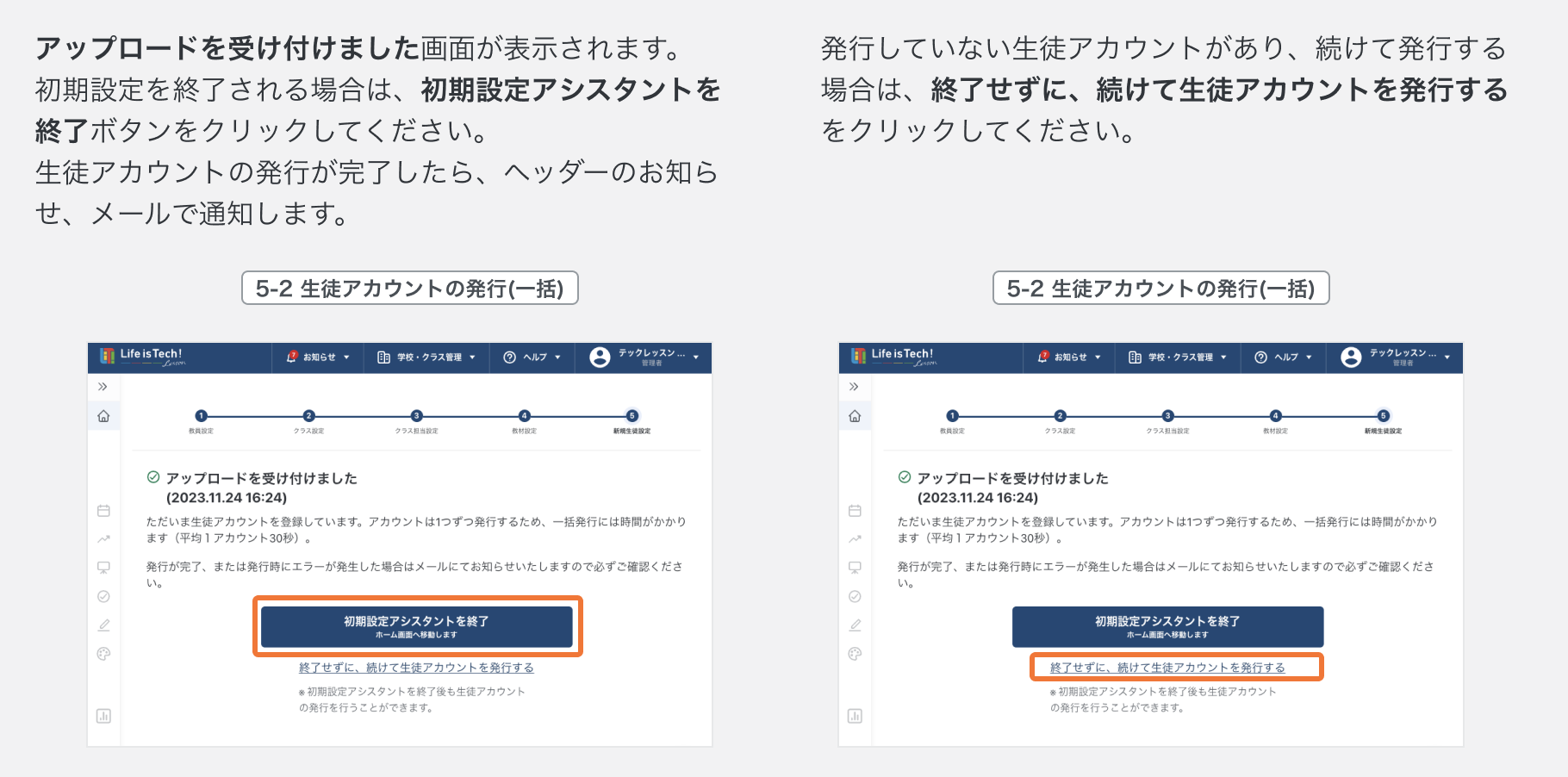 【詳細設定】の初期設定アシスタントで教材を設定したクラスに生徒アカウントを発行する手順です。
