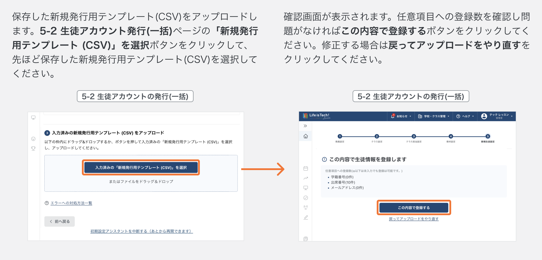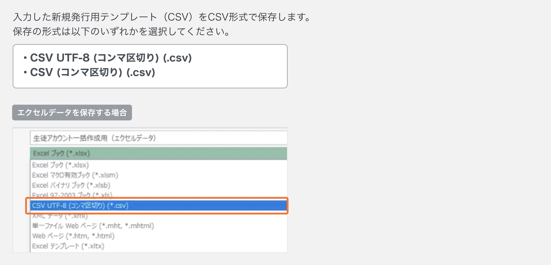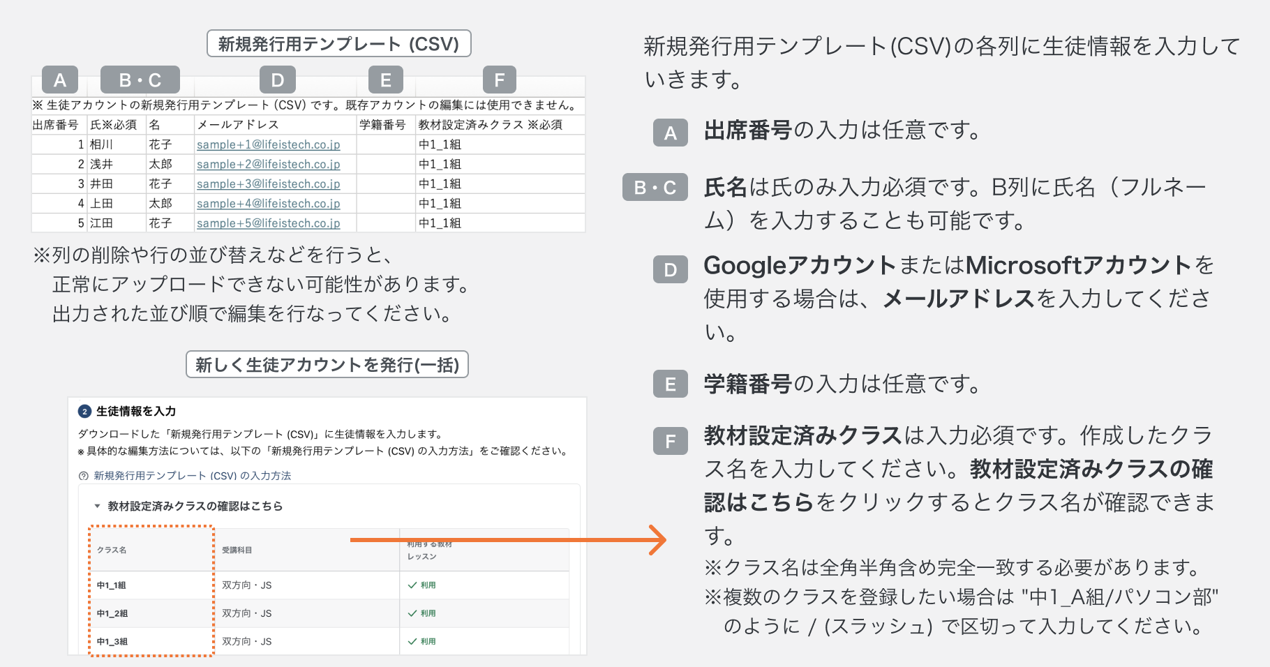 「新しく生徒アカウントを発行する時、新規発行用テンプレート(CSV)をアップロードするとエラーになります」記事へ