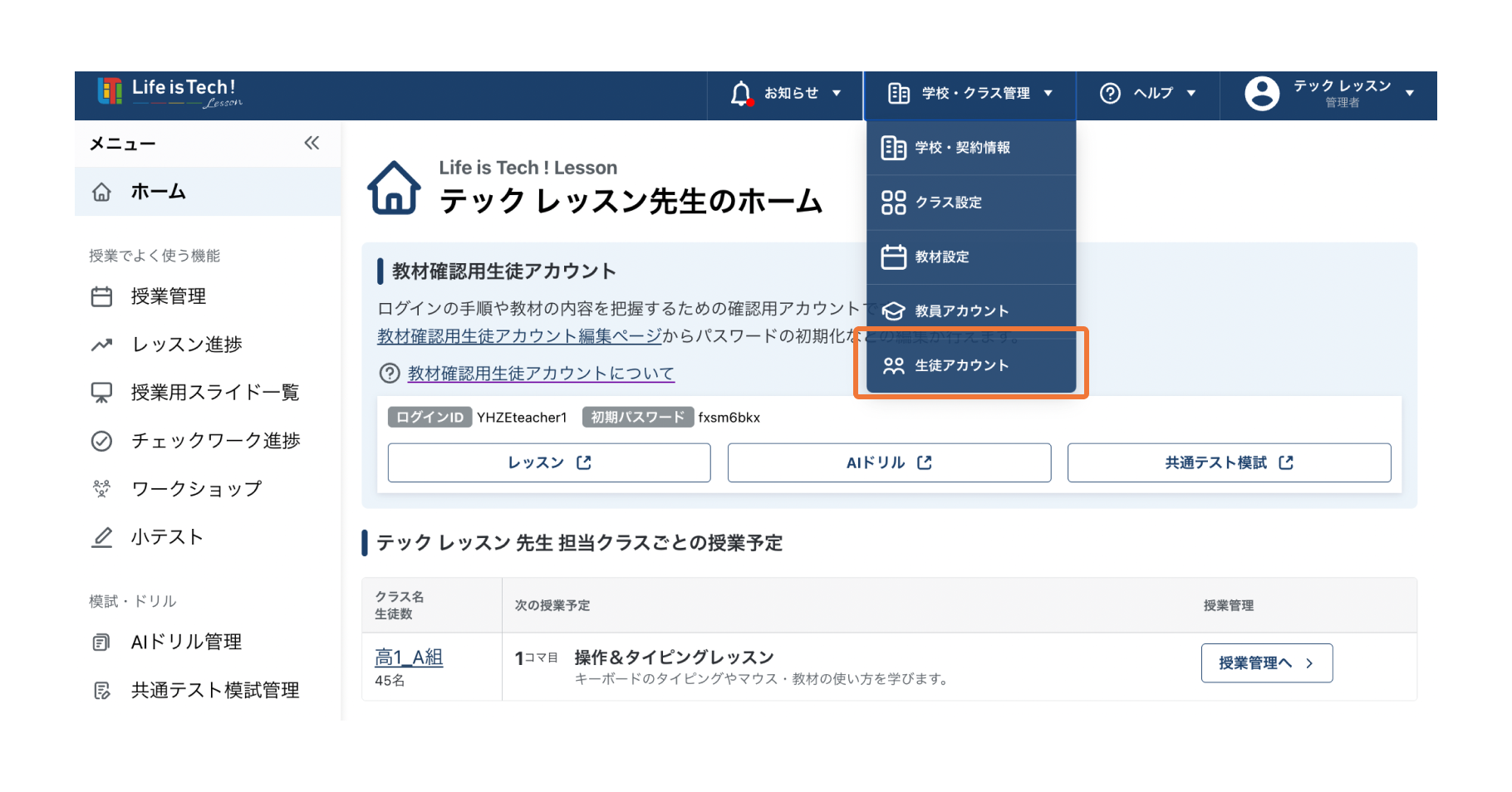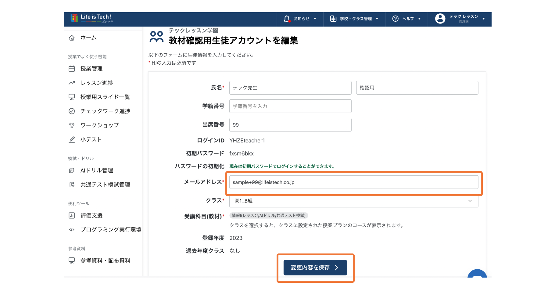 教材確認用生徒アカウントに先生のメールアドレスを設定することで、授業前に先生自身で試すことができます