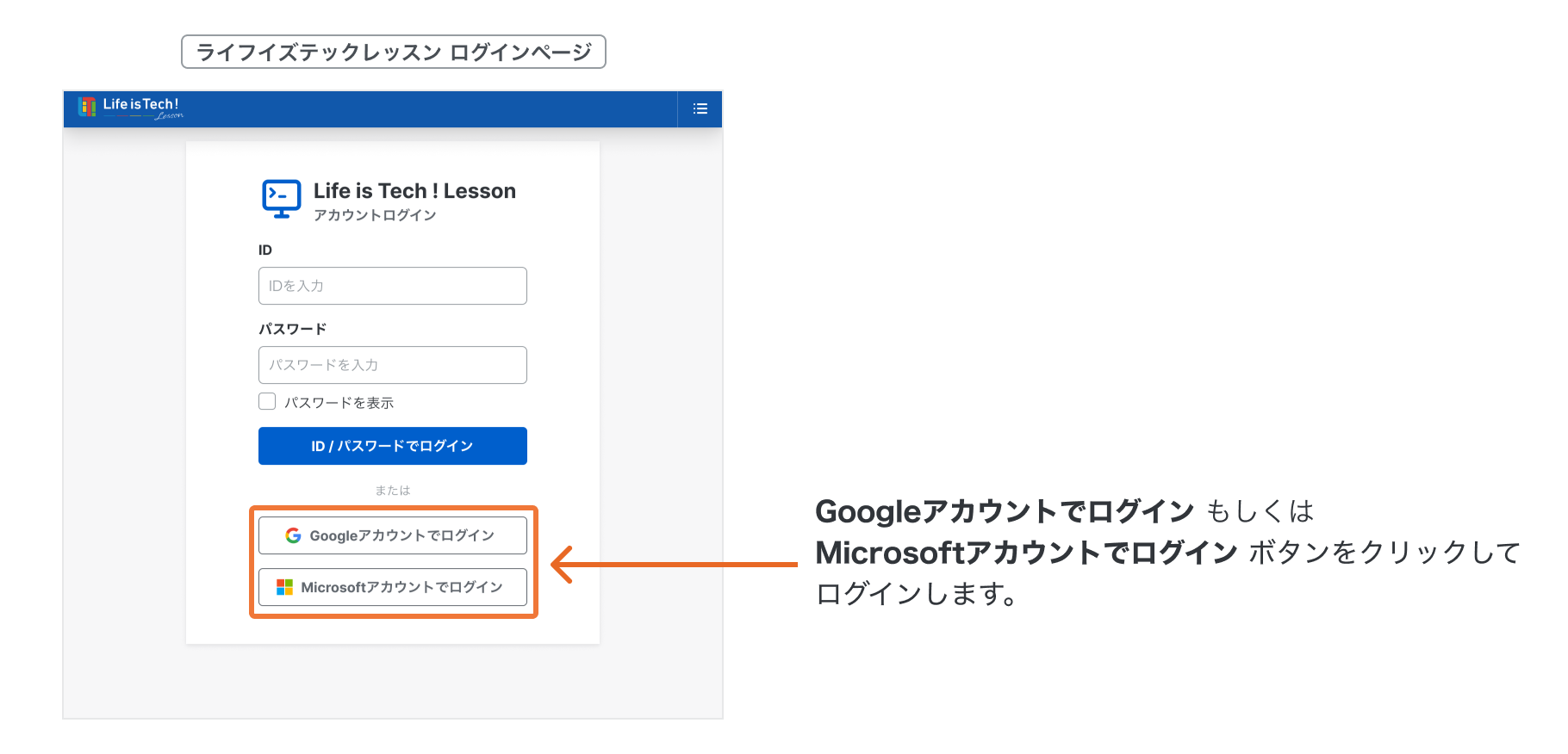 生徒用ログイン画面にて、Googleアカウントでログイン もしくは Microsoftアカウントでログイン をクリックしてログインします。