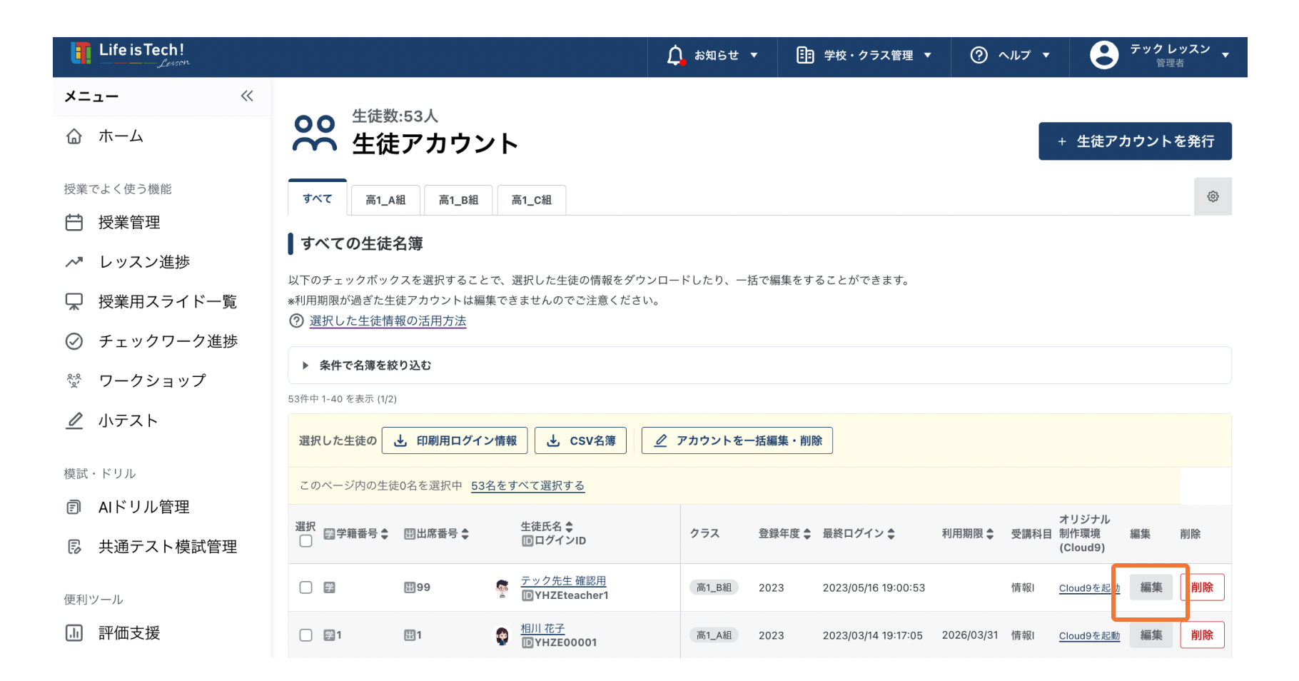 生徒アカウントページを開く