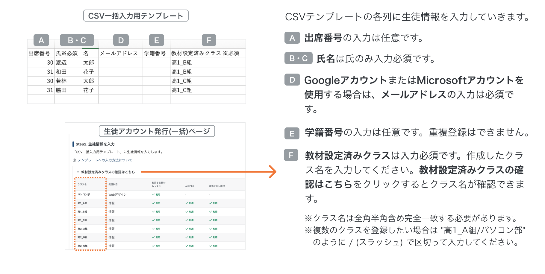 入力できるクラス名は、Step2. 生徒情報を入力 ▶︎教材設定済みクラスの確認はこちら より確認できます。