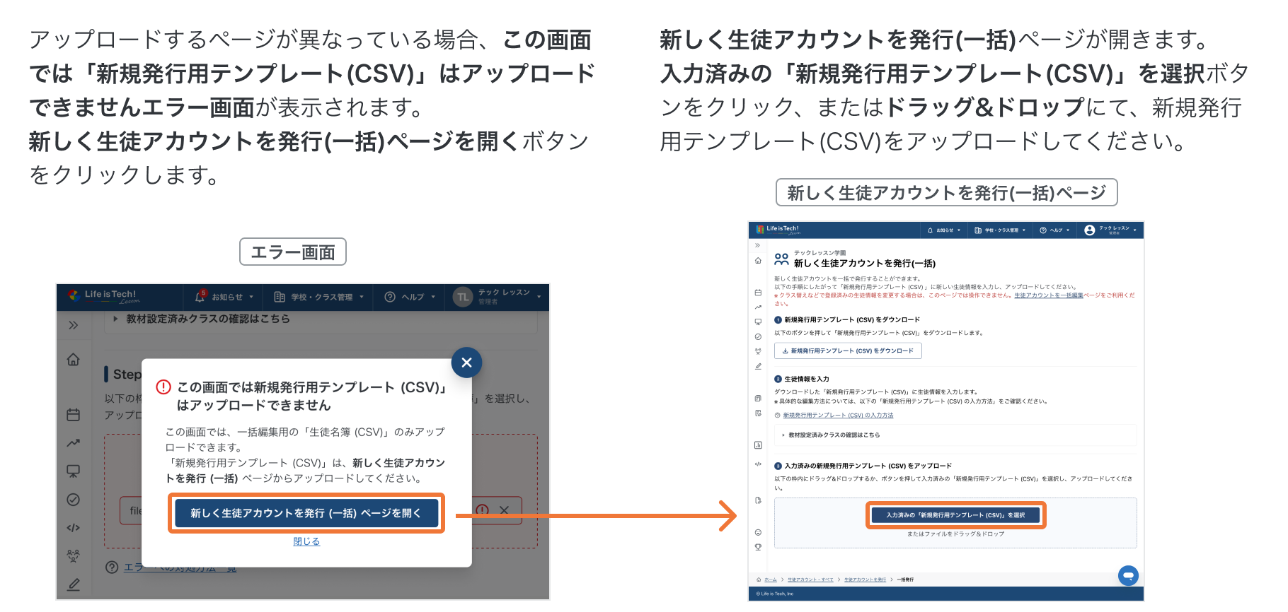 エラー画面の「新しく生徒アカウント発行(CSV)ページを開く」ボタンをクリックし、新しく生徒アカウントを発行(一括)ページより再度アップロードを行なってください。