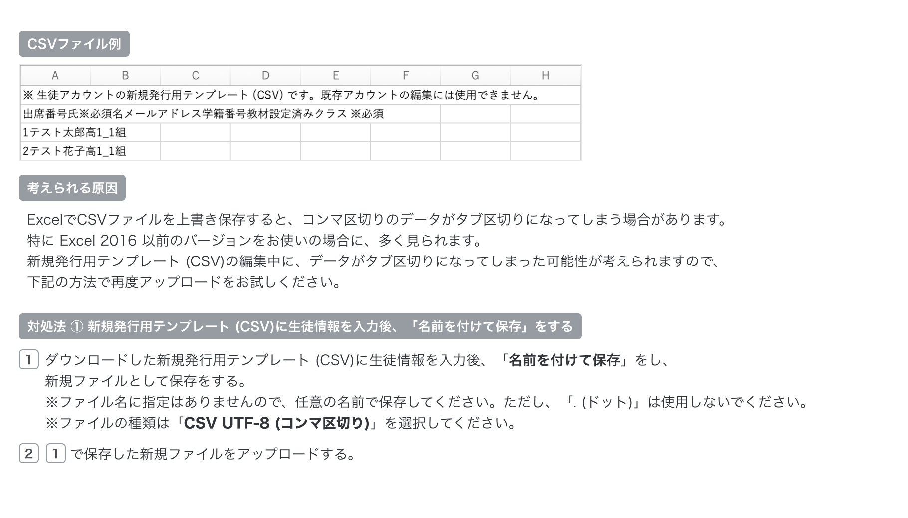 アップロードしたファイルを開いた際に、「入力した全データがA列に表示される」といったデータ崩れが起きている場合、Excelでの編集中に、意図せず「タブ区切り」など、「コンマ区切り(CSV)」とは異なる形式で保存された可能性があります。
