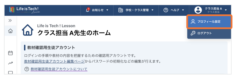 「プロフィール設定」より、ご自身で変更が可能です。管理者の先生は、他のクラス担当の先生のメールアドレスも変更が可能です。