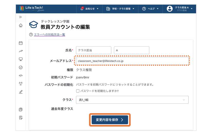 管理者の先生が、他のクラス担当の先生のログインID(メールアドレス)を変更する