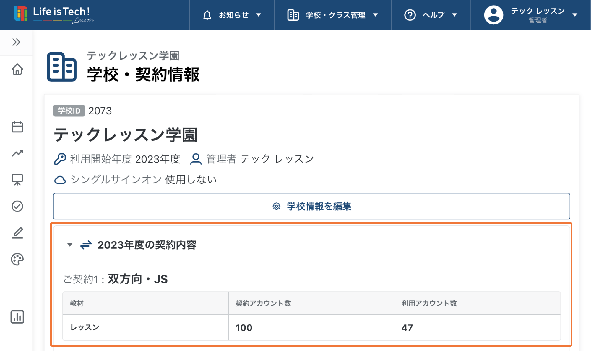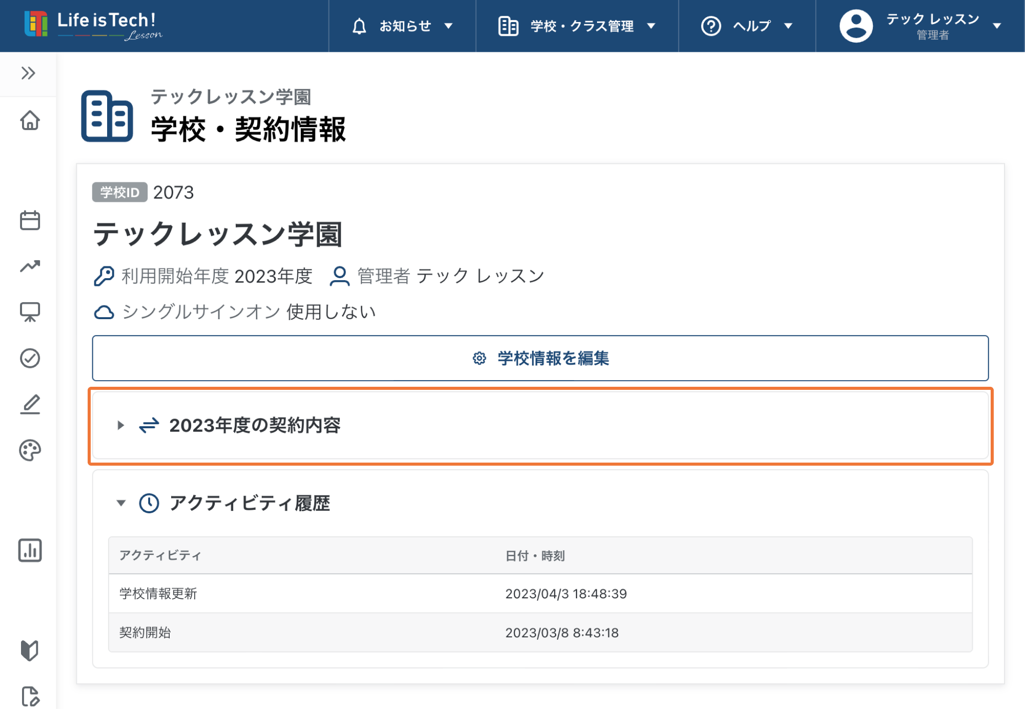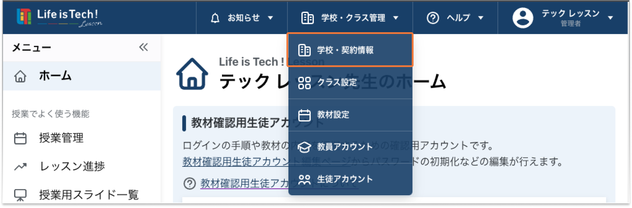 ヘッダー > 学校・クラス管理 > 学校・契約情報をクリックする