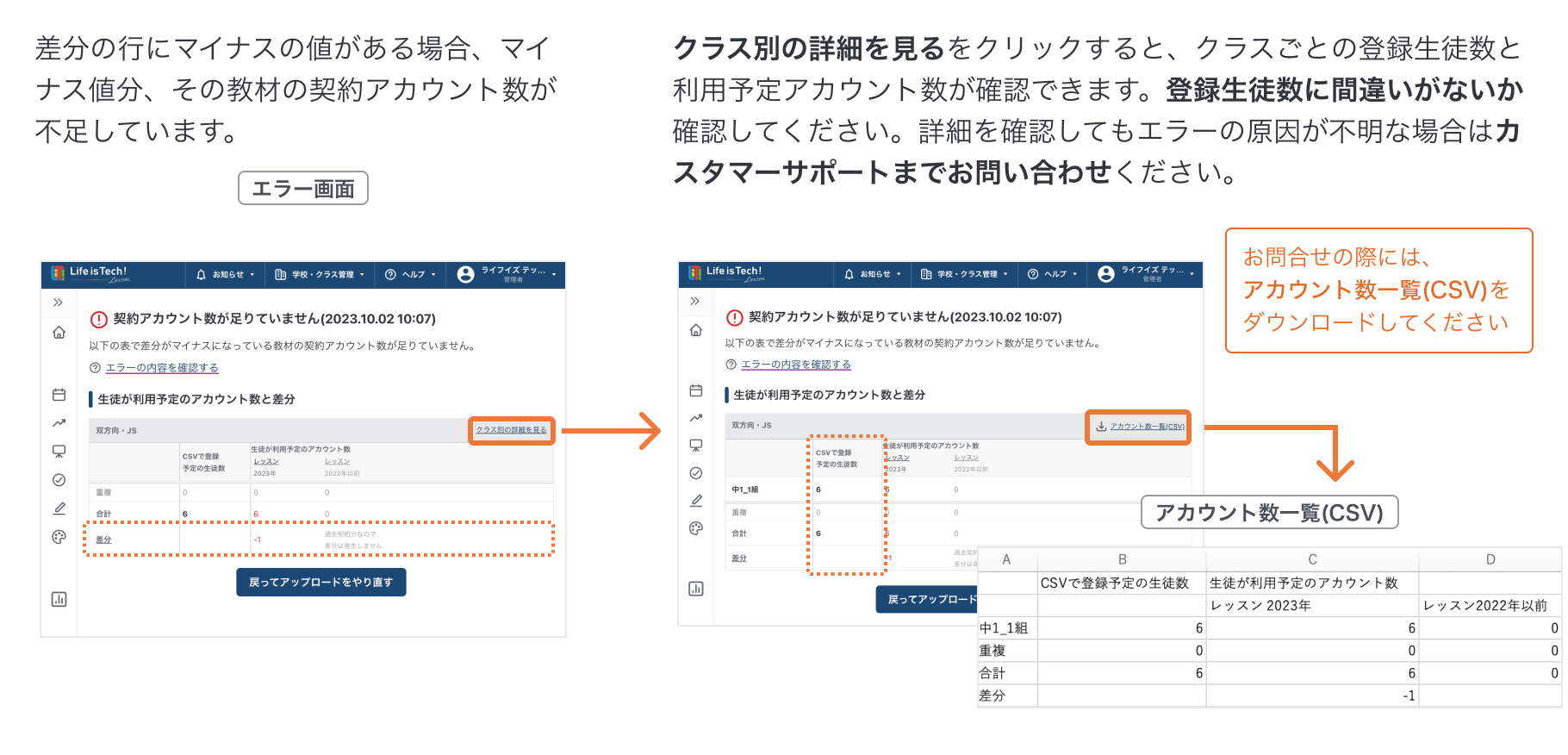 契約アカウント数を登録アカウント数が超過した場合にエラーがでます。差分が出ている教材のアカウント数が不足しています