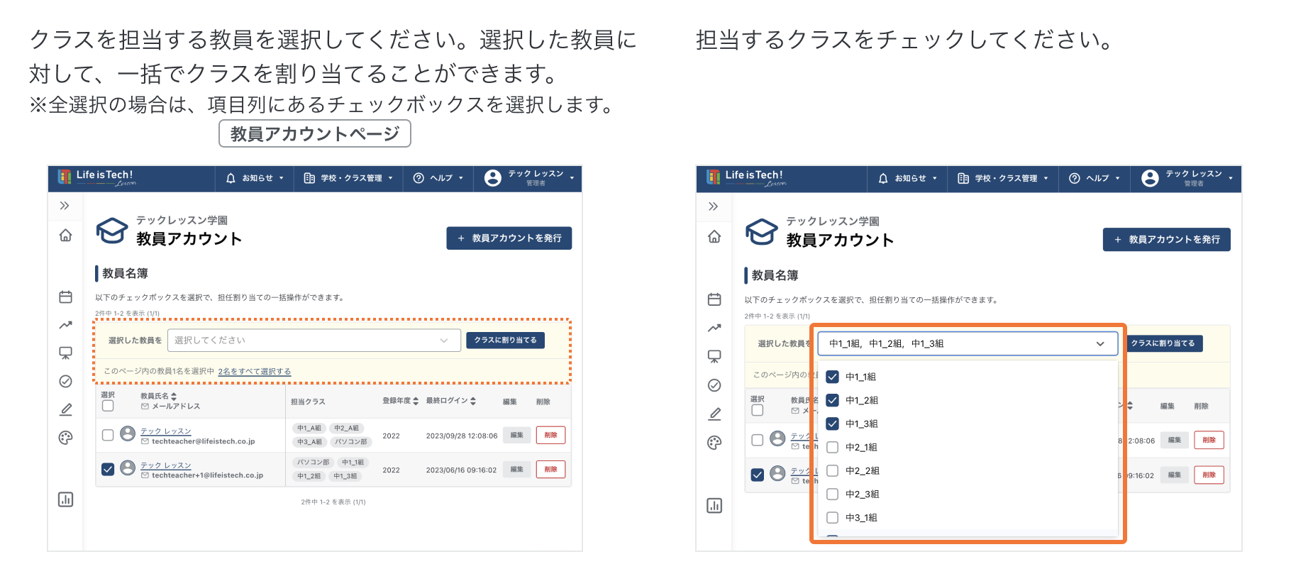 次に生徒アカウントを編集して、❶、❷で作成したクラスに所属させます。