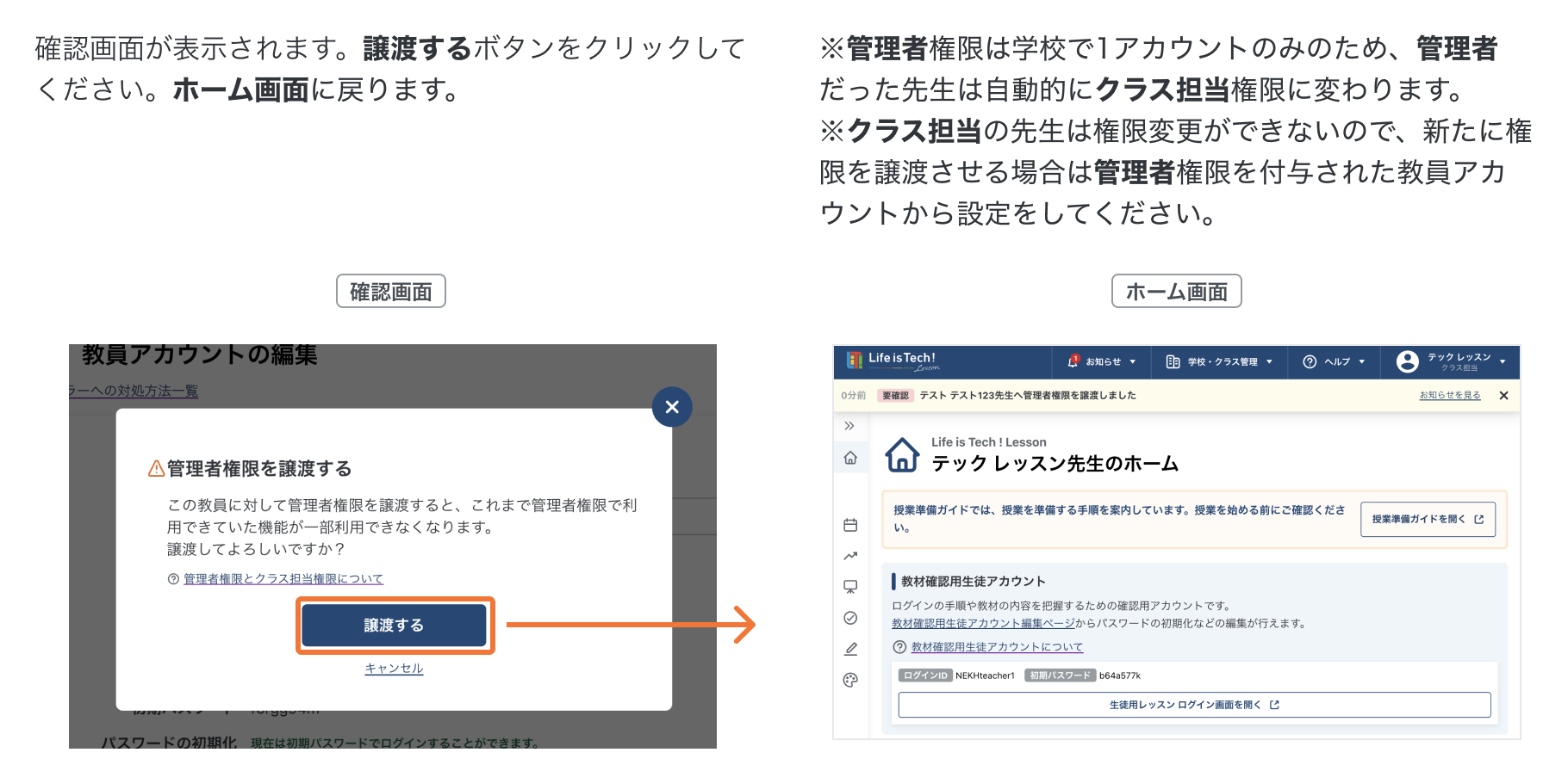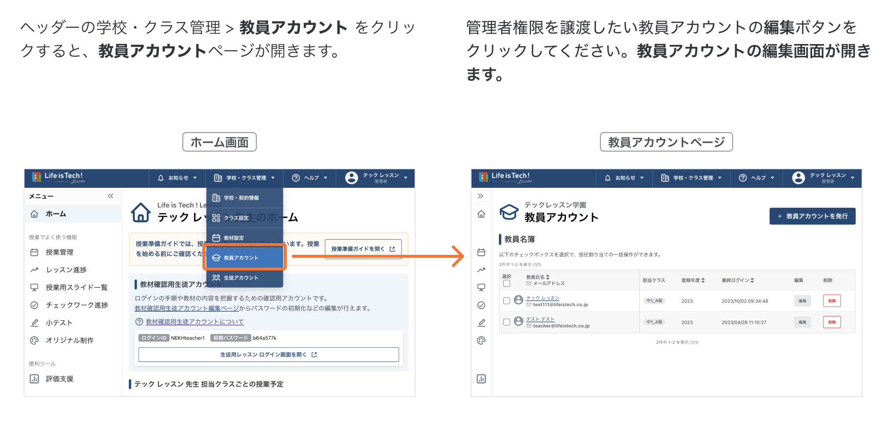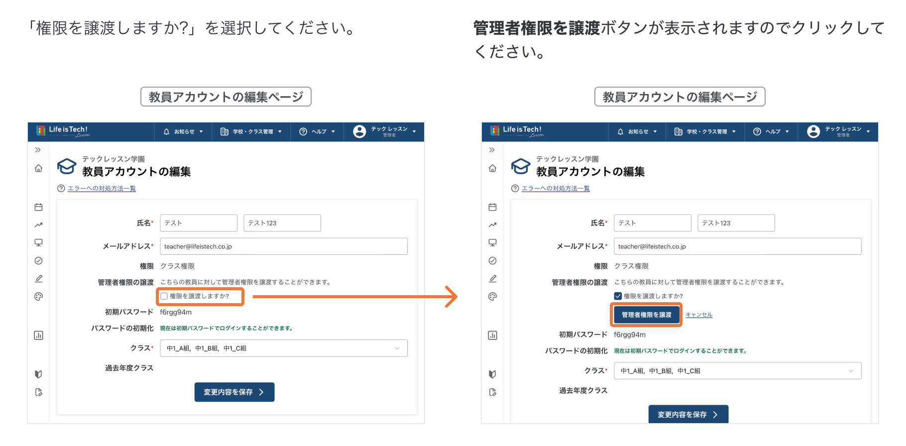 教員アカウントの権限を変更する 教員アカウントの権限を変更する手順です。管理者権限の先生のみ操作可能です。 目次【はじめに】管理者権限とクラス担当権限について1. 教員アカウントページを開く2. 管理者権限を譲渡する 【はじめに】管理者権限とクラス担当権限について 1. 教員アカウントページを開く 2. 管理者権限を譲渡する