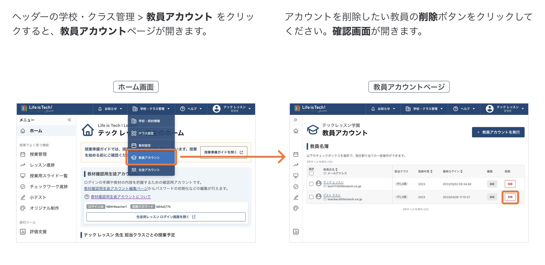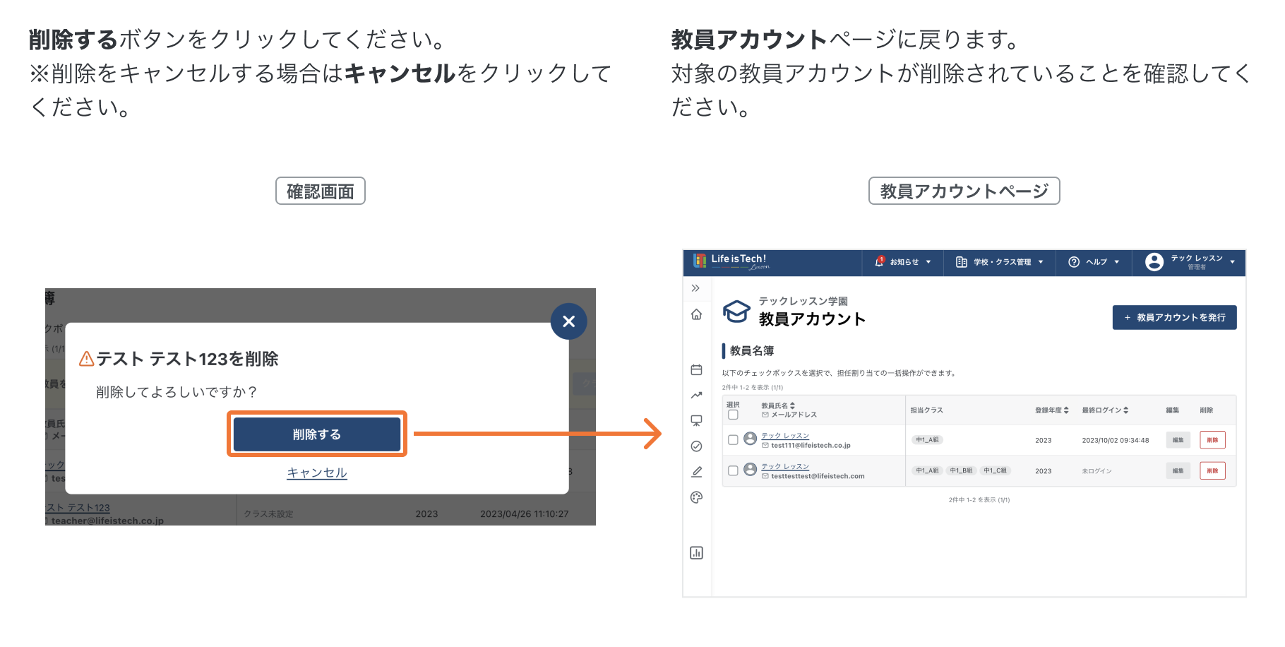 ※ 教員アカウントを削除すると、教員画面にログインができなくなり、すべての機能を利用できなくなります。