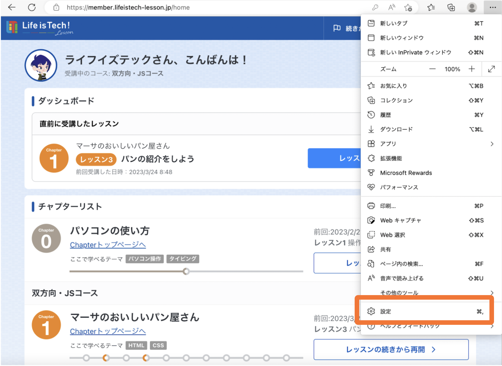 ①画面右上のメニューボタンをクリックし、表示されたメニューから「設定」を選択してください。