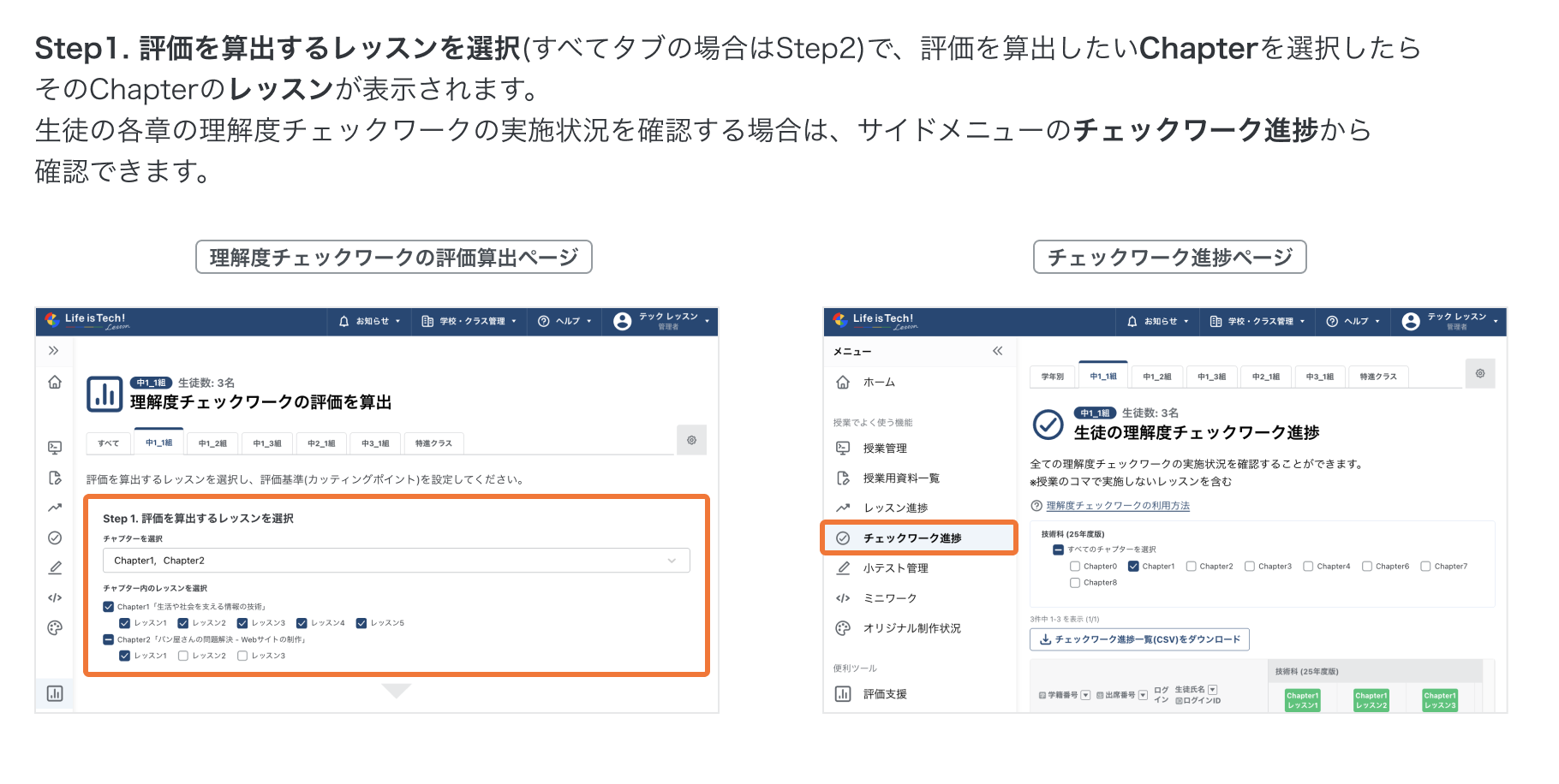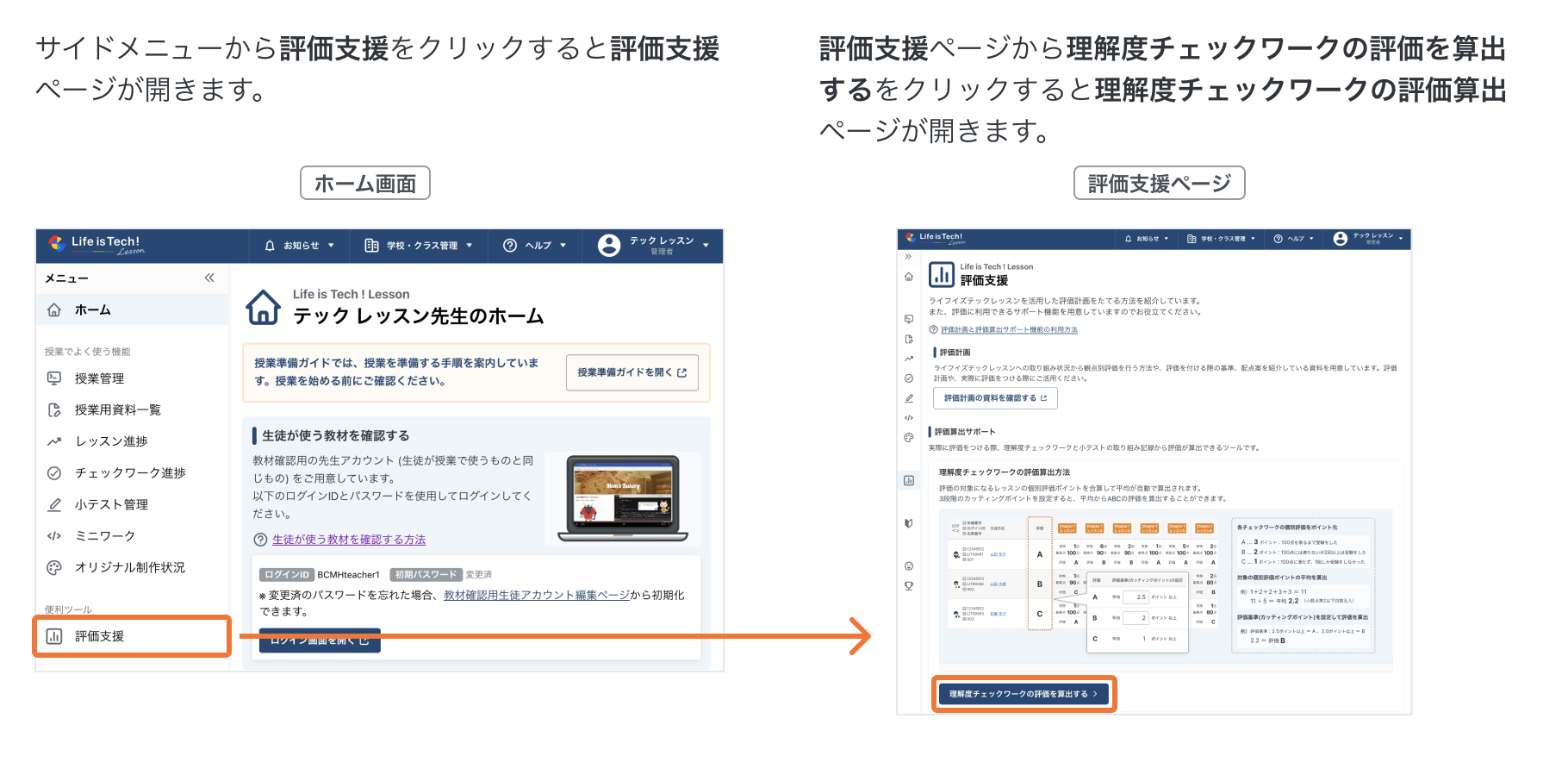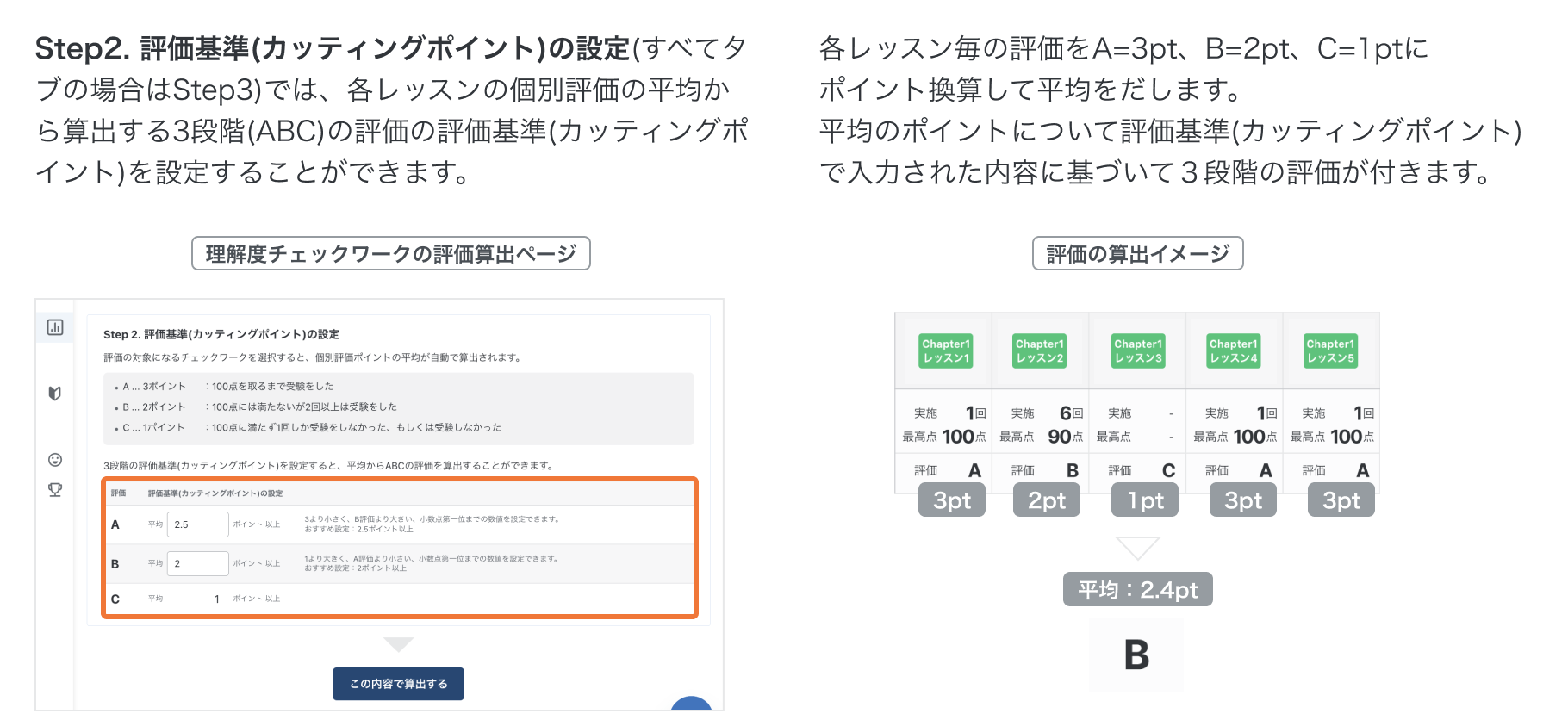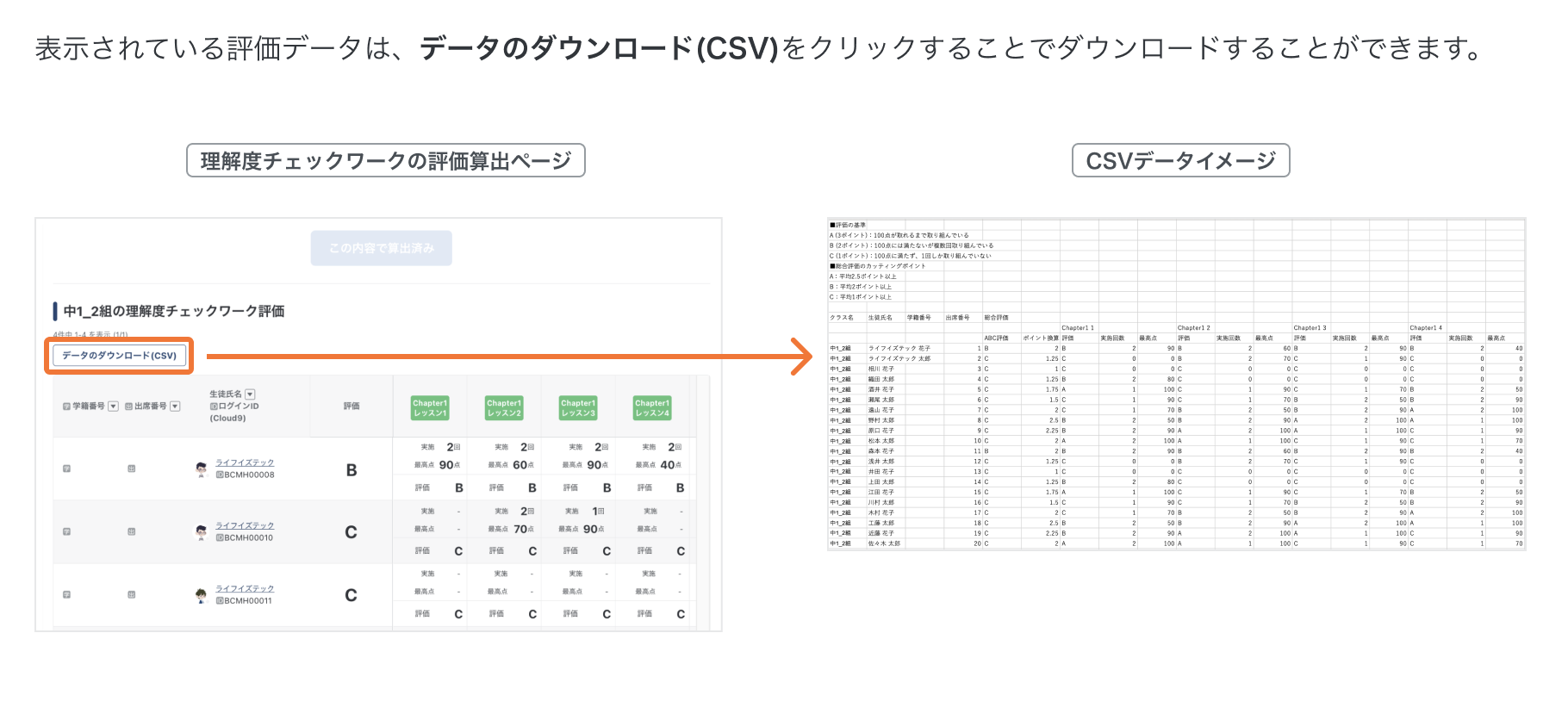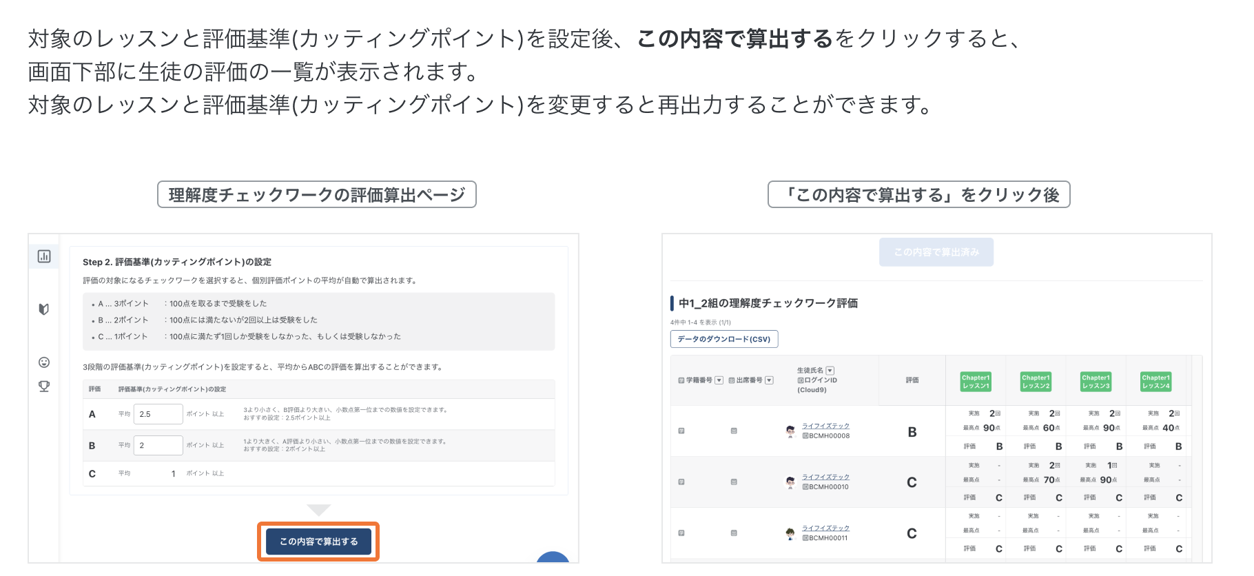 評価算出サポート機能の使い方(理解度チェックワーク) 理解度チェックワークの評価算出サポートについての説明です。 理解度チェックワークの評価算出サポートについて 1. 理解度チェックワークの評価算出ページを開く 2. 評価をするクラスを選択する 3. 評価を算出するレッスンを選択する 4. 評価基準(カッティングポイント)を設定する 5. 評価を算出する 6. 算出したデータをCSVでダウンロードをする その他の関連記事 生徒の並び順を変更することはできますか