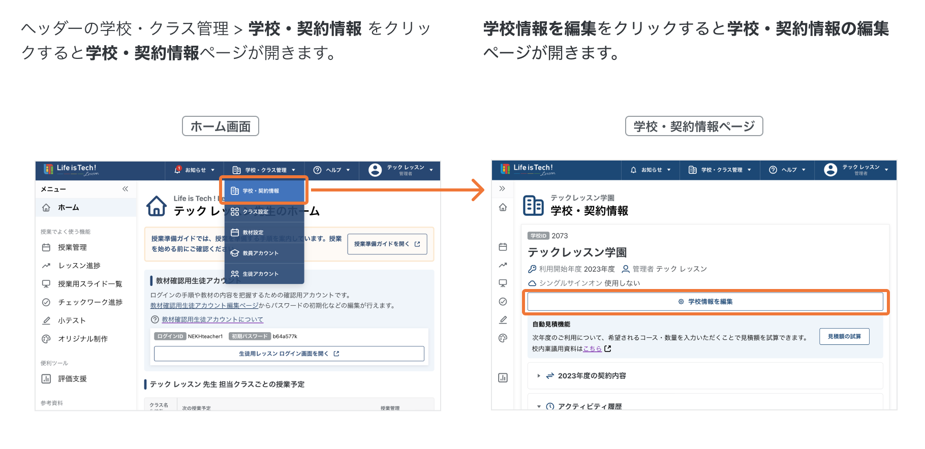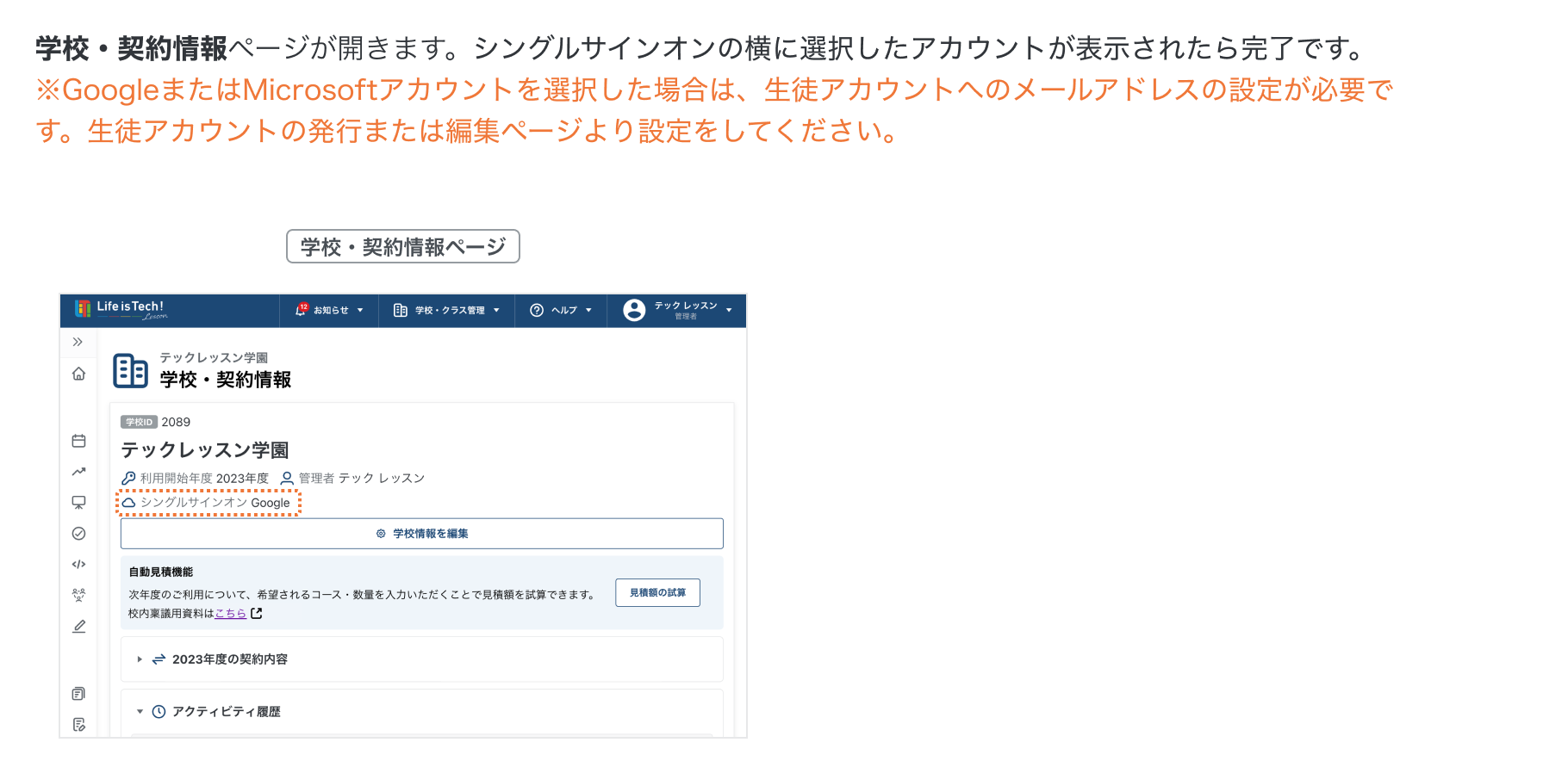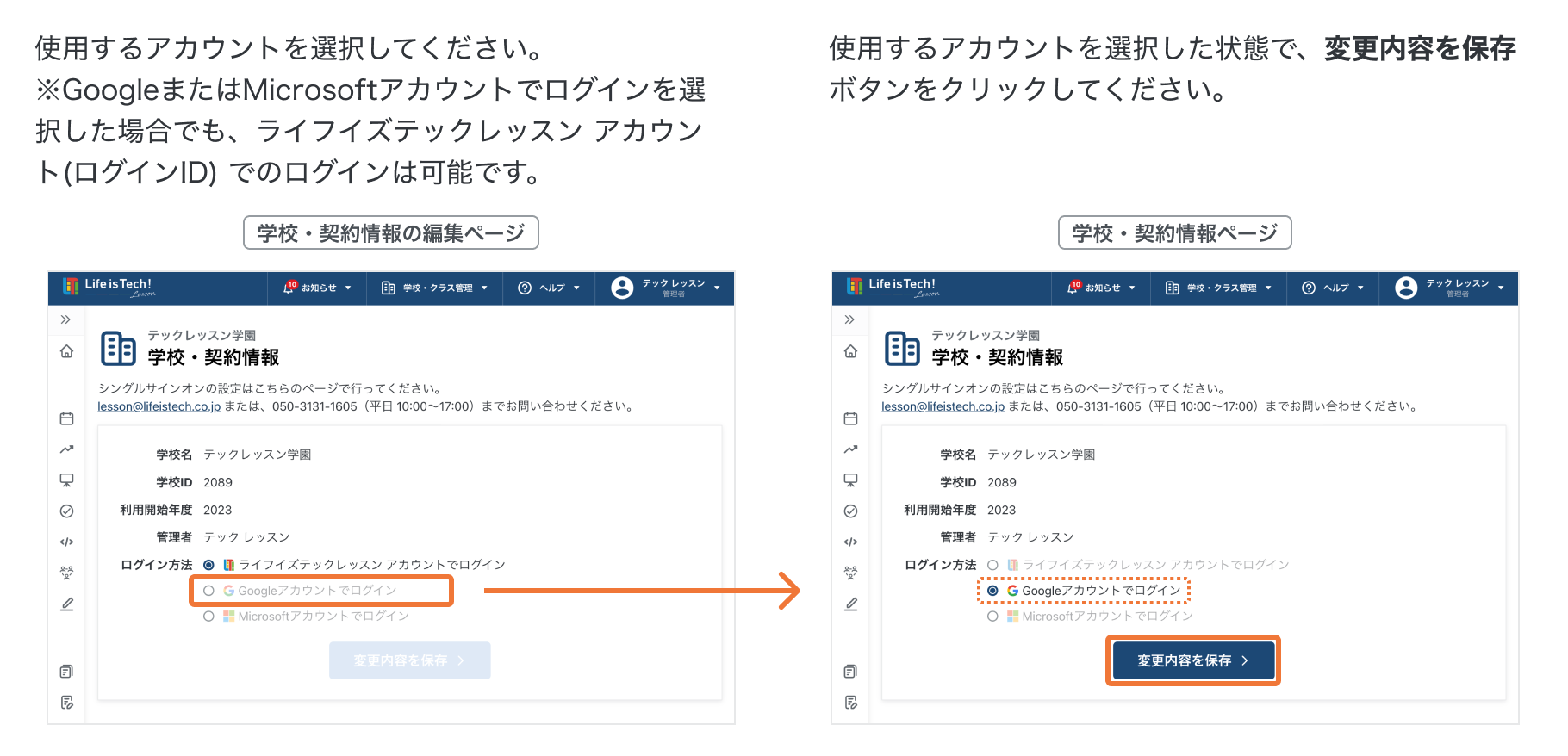 使用するアカウント(ライフイズテックレッスン・Google・Microsoftアカウント)を変更する 使用するアカウント(ライフイズテックレッスン・Google・Microsoftアカウント)を変更する手順です。 1. 学校・契約情報ページを開く 2. 使用するアカウントを選択する