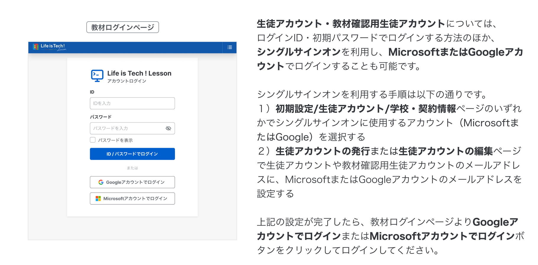 アカウントについて アカウントについての説明です。 1. 教員アカウントについて 2. 教材確認用生徒アカウントについて 3. 生徒アカウントについて 4. MicrosoftまたはGoogleのアカウントについて