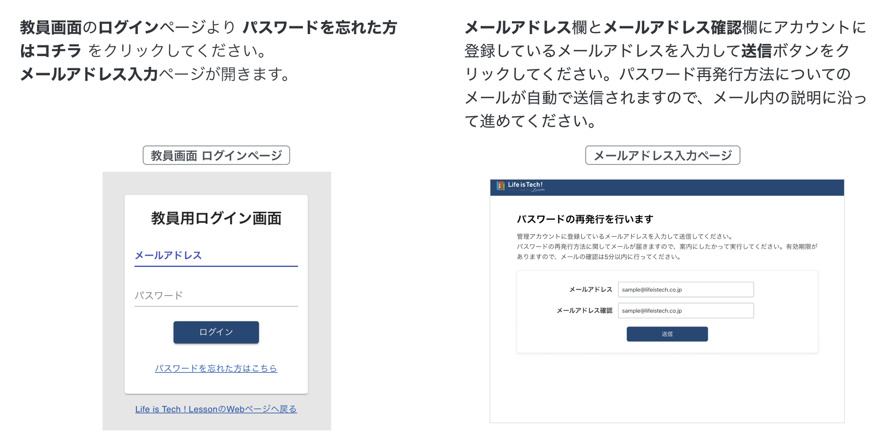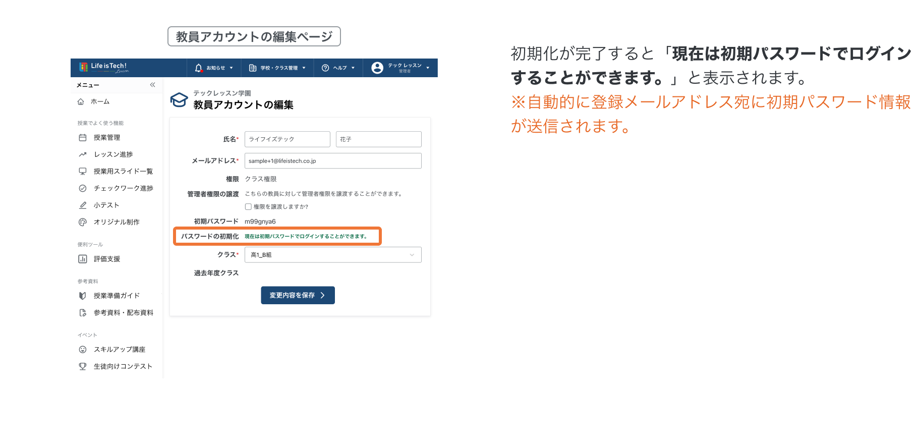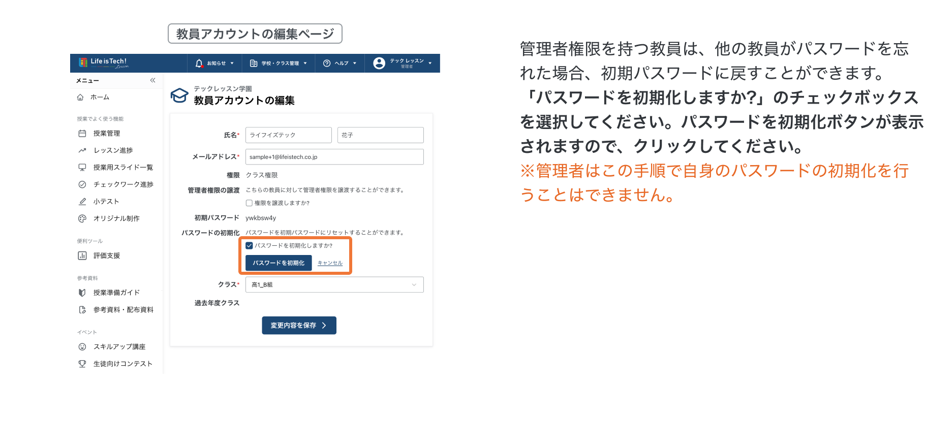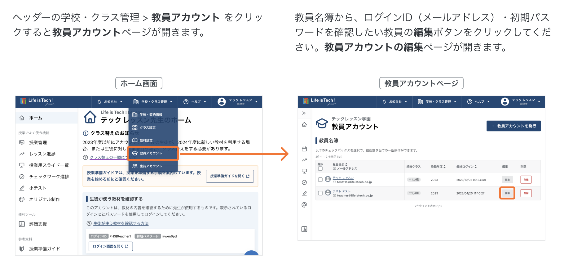 教員のログインID・初期パスワードを確認する・パスワードを初期化する 教員のログインID・初期パスワードを確認する手順です。 1. 教員アカウントページを開く 2. ログインID・初期パスワードを確認する 3. 教員アカウントのパスワードを忘れてしまった場合 4. 管理者が他の教員アカウントのパスワードを初期化する