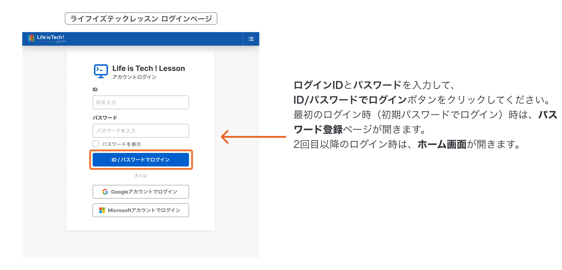 Google管理コンソールの設定変更完了までに教材を利用する場合は、ログイン画面にて、ライフイズテックレッスンアカウントのログインIDとパスワードを入力することで教材にログインできます。