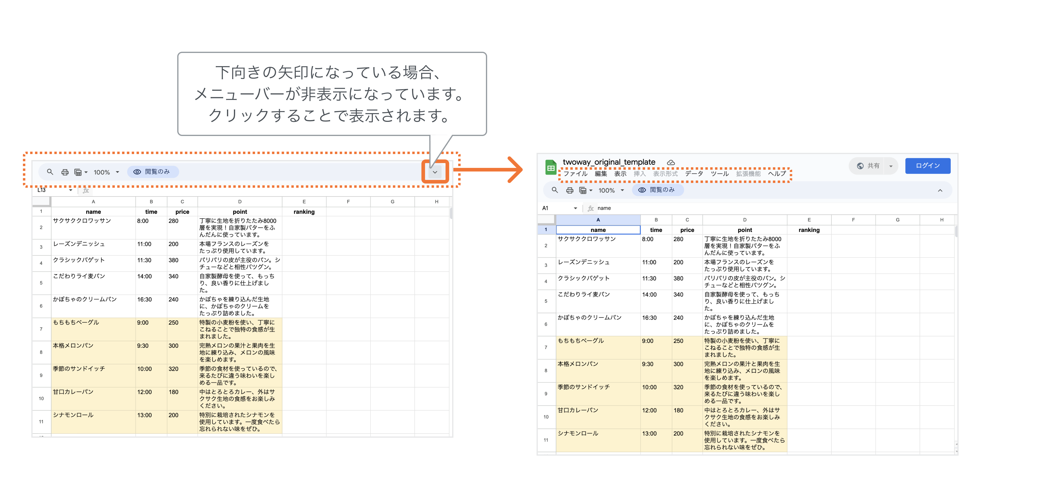 Chapter4「オリジナル検索サイト制作」では、Googleスプレッドシートのメニューバーからファイルのコピーをしたり、拡張機能「Google Apps Script」を使用したりします。メニューバーが表示されない場合は、下記いずれかの可能性があります。