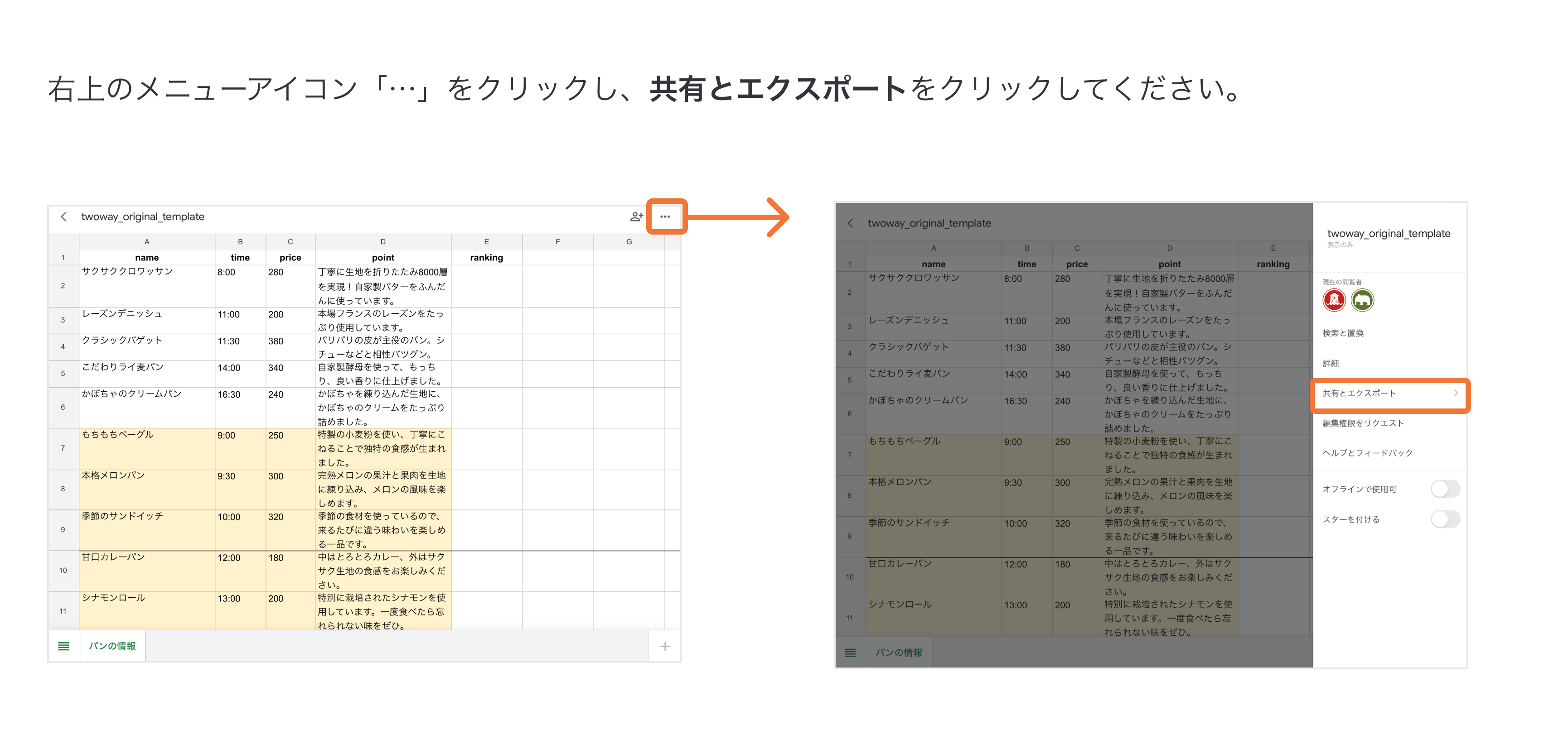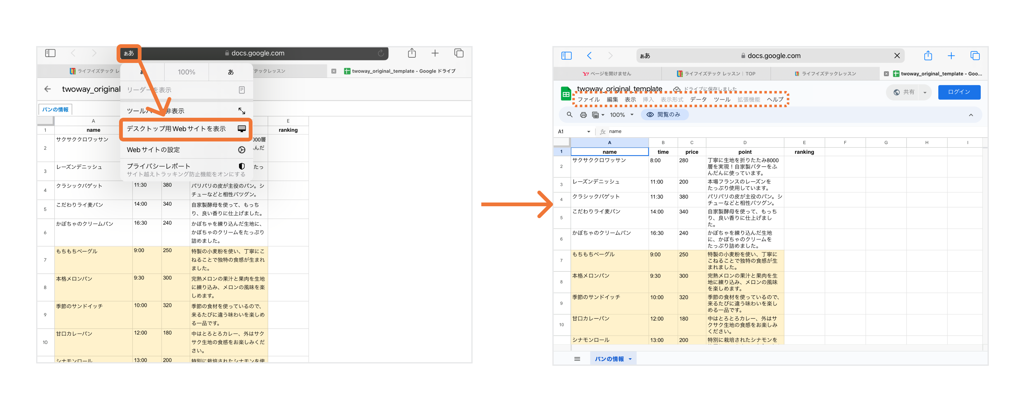 ※Safariでスプレッドシートを開いた時に、メニューバーが表示されない場合は、「1. メニューバーが非表示になっている」「2. モバイル用Webサイト表示になっている(iPad・Safariでご利用の場合)」をご確認ください。
