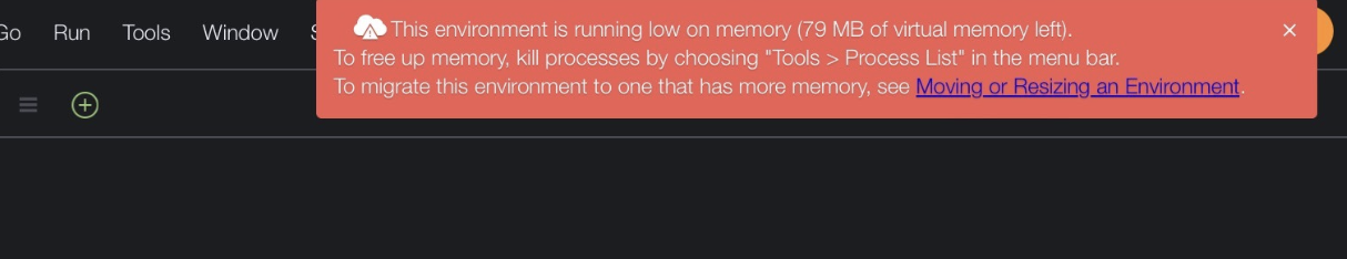 Cloud9を起動後、画像のように「This environment is running low on memory…」というエラーメッセージが表示され、ファイルを編集できない場合、
