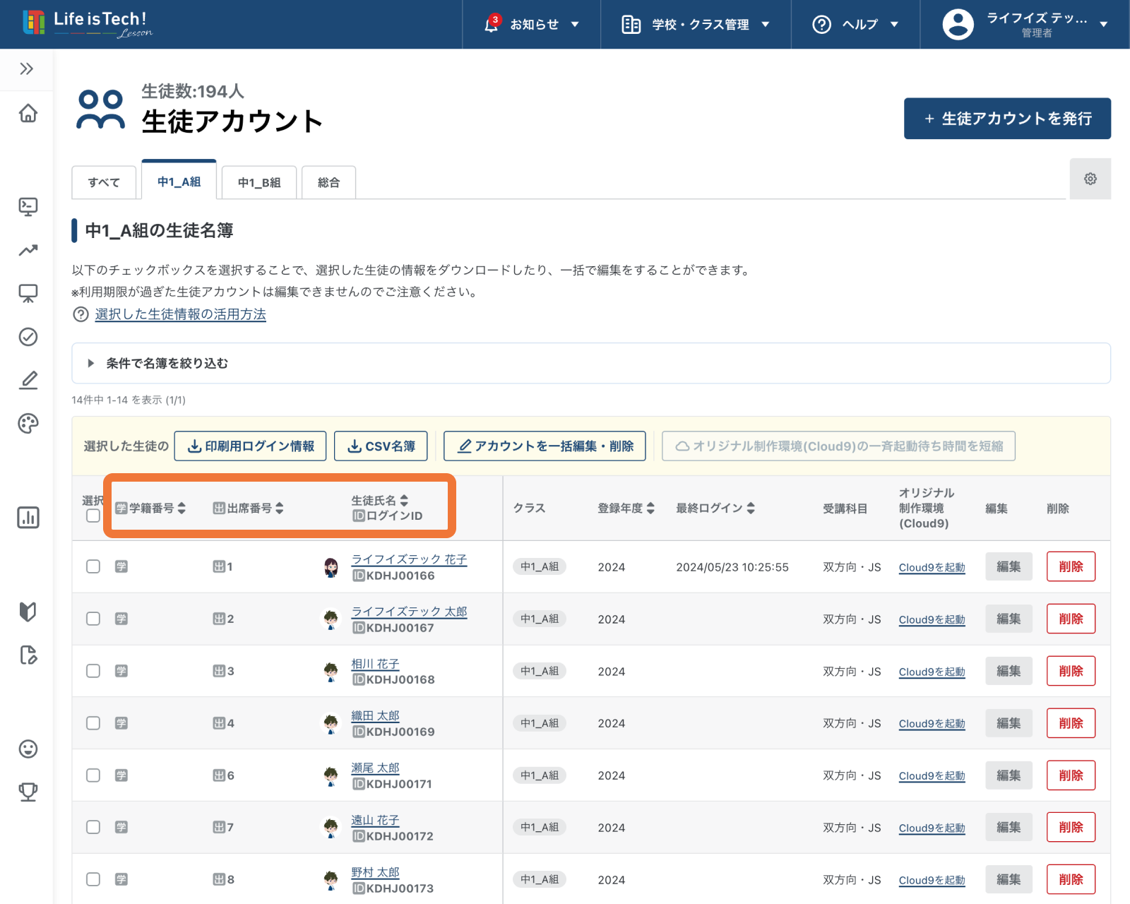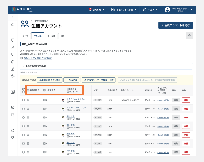生徒アカウントの一括編集方法については、以下の記事をご確認ください。