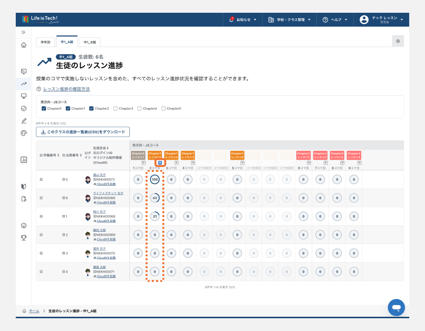 以下の機能において、生徒の「氏名」、「学籍番号」、「出席番号」のいずれかで並べ替えることができます。レッスン進捗ページでは、レッスンごとの進捗率で並べ替えることができます