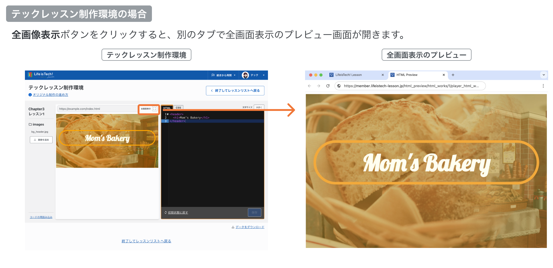 生徒が、テックレッスン制作環境やCloud9制作環境のプレビュー画面を表示したパソコンやタブレットを机の上などに置き、他の人が見られるようにします。