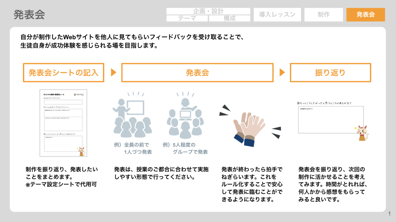 制作したWebサイトを通して伝えたいことや、次回の制作に活かしたいことを記入する、発表会シートをご用意しています。ぜひご活用ください。