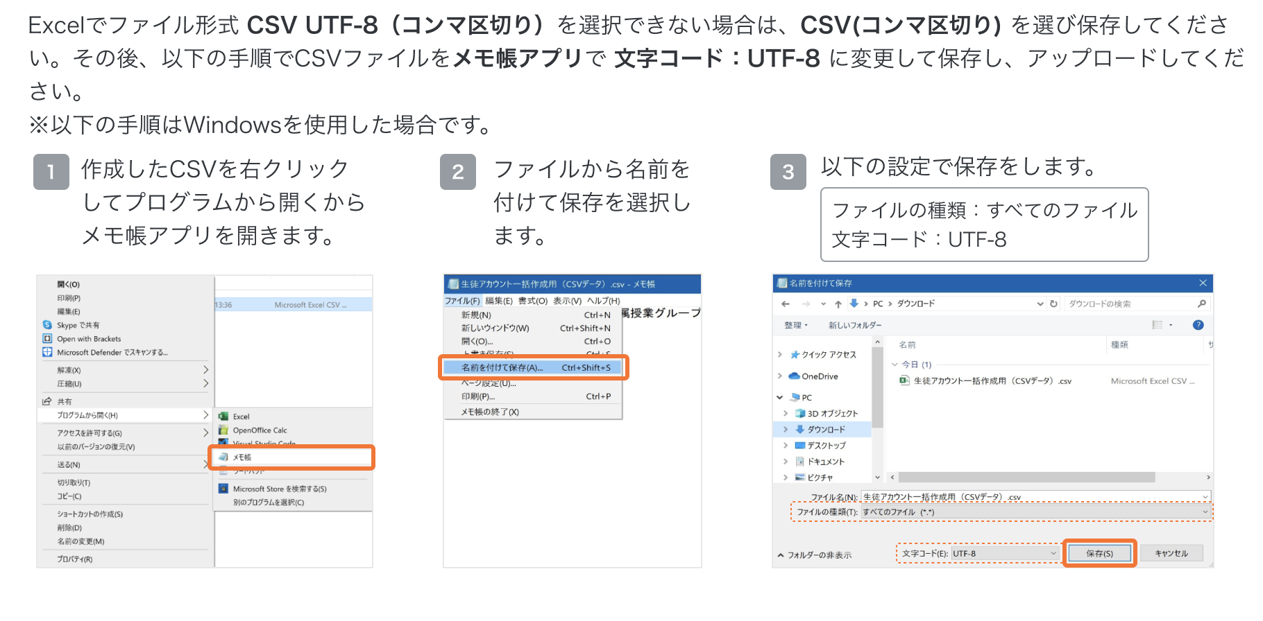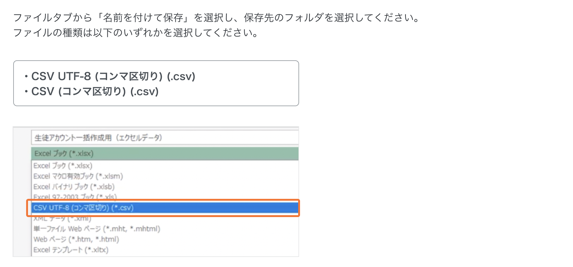 Excelソフトを使って、生徒アカウントの一括発行や一括編集時のCSVファイルを編集する場合は、標準の漢字に置き換えて入力するか、文字コードを「UTF-8」に変更の上、アップロードしてください。