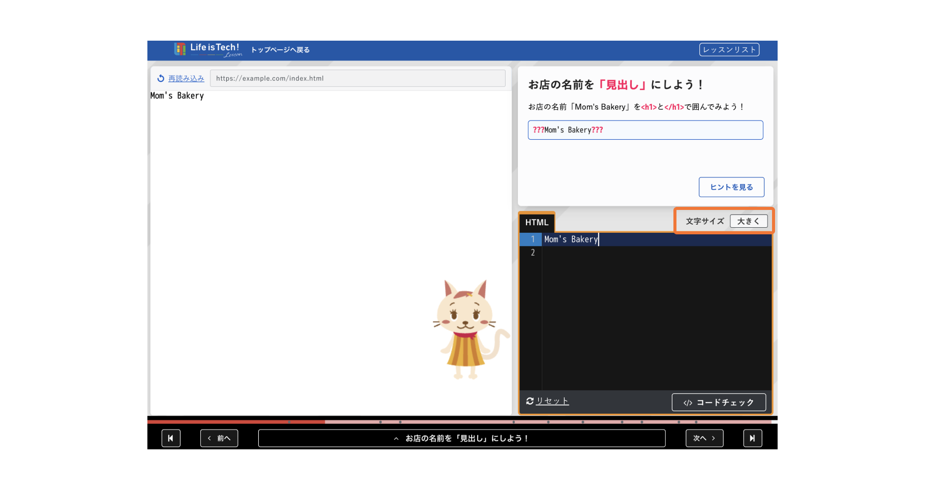 レッスン内の文字が小さいので大きくしたいです コードウィンドウの文字サイズ拡大機能や、ブラウザのズーム機能をご利用ください コードウィンドウの文字サイズを大きくする ブラウザを全画面表示にする ブラウザのズーム機能を使う 1. コードウィンドウの文字サイズを大きくする コードウィンドウの右上に、文字サイズの拡大/縮小ボタンがあります。大きく をクリックすると、コードウィンドウ内の文字が大きくなります。 2. ブラウザを全画面表示にする ブラウザが全画面表示になっていない場合は、全画面表示に切り替えてください。ブラウザごとの切り替え方法は、こちらをご確認ください。 3. ブラウザのズーム機能を使う ブラウザのズーム機能を使うと、文字を拡大表示することができます。ブラウザごとのズーム機能の利用方法は、こちらをご確認ください。