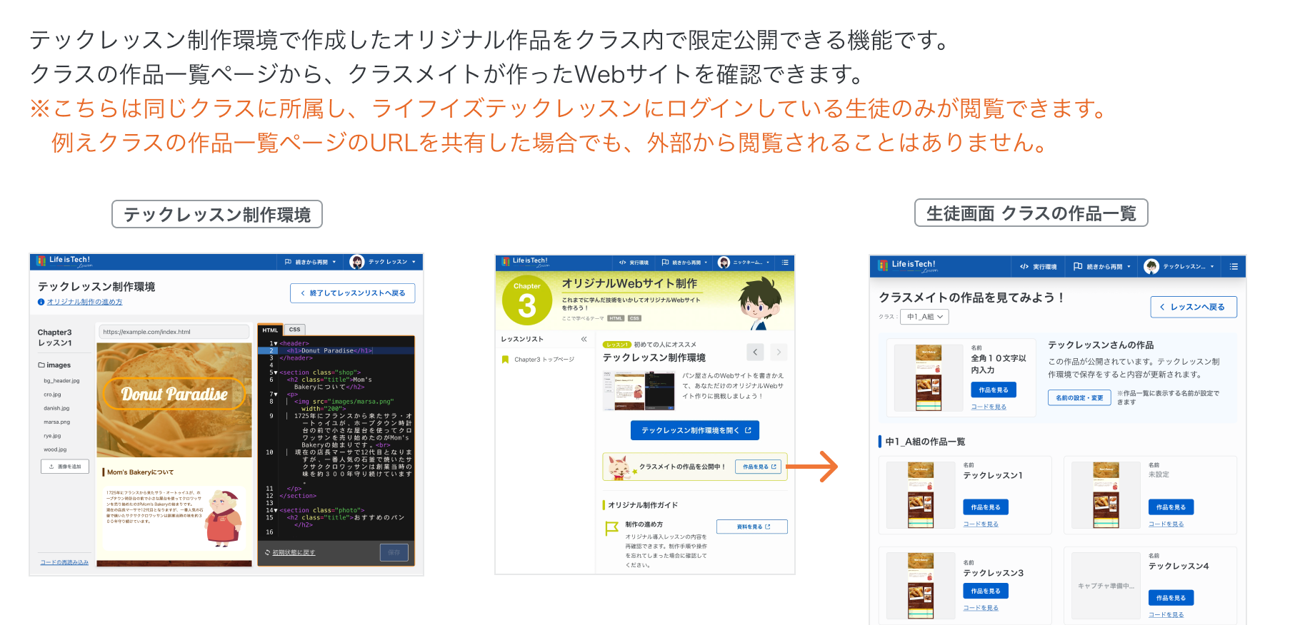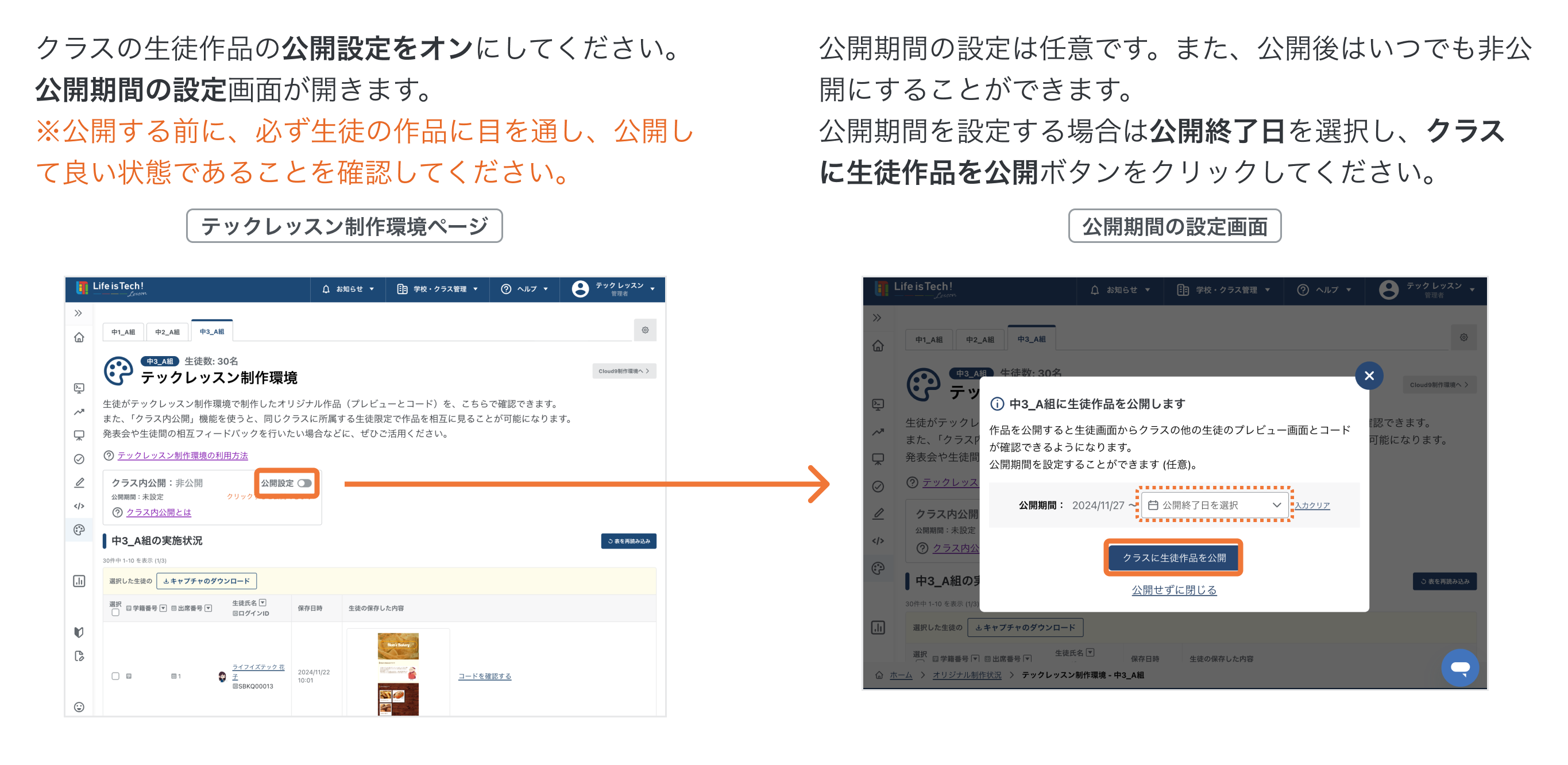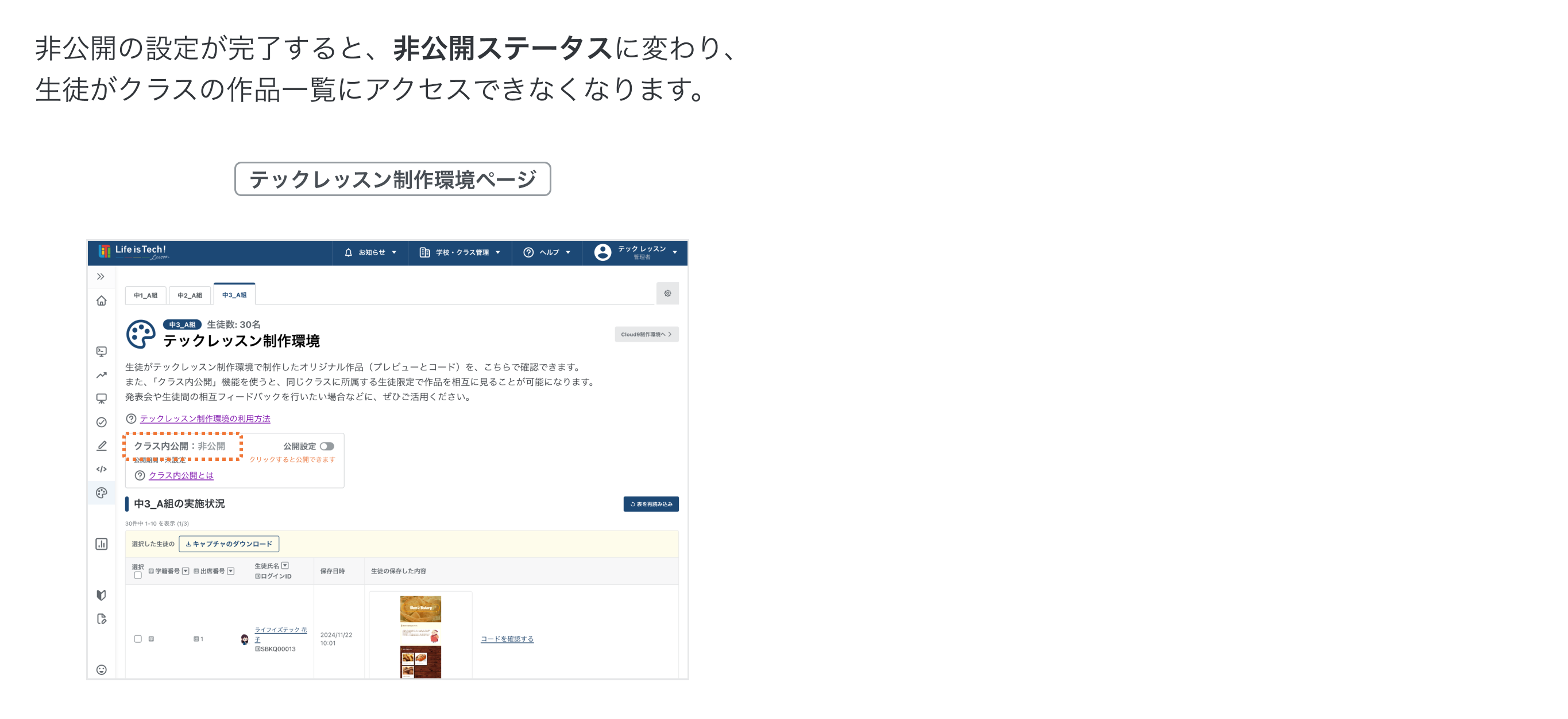 生徒がテックレッスン制作環境で制作した作品を、クラス内に公開する手順です。