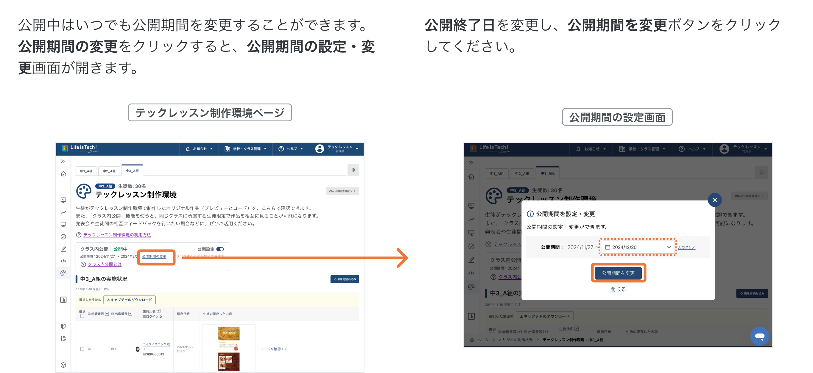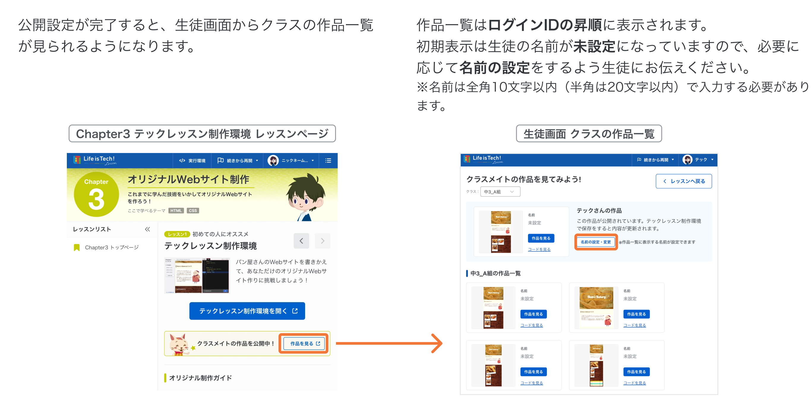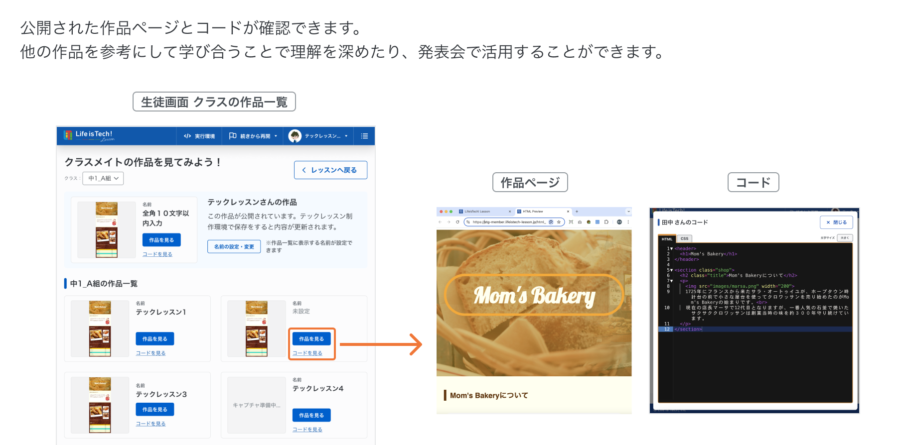 生徒がテックレッスン制作環境で制作した作品を、クラス内に公開する手順です。