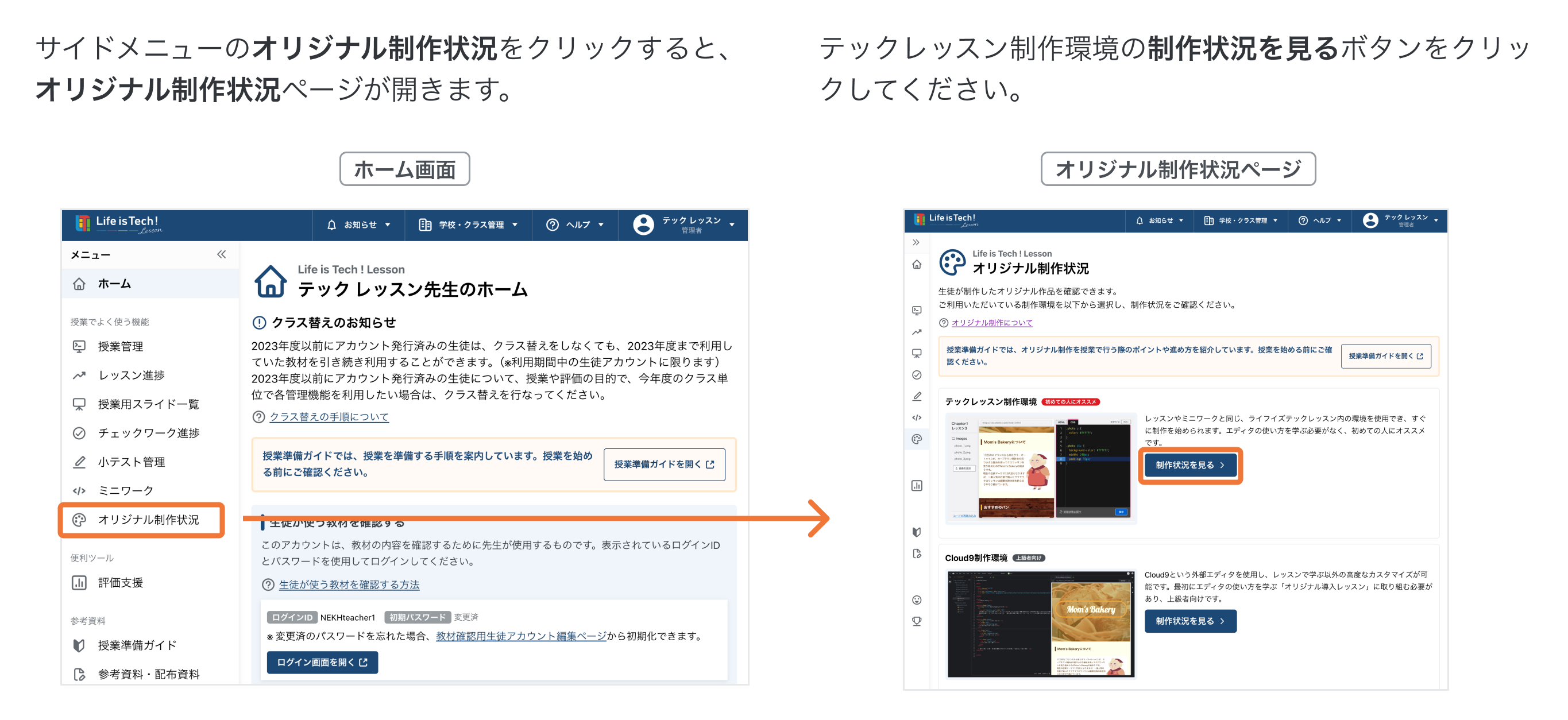 1. 教員画面のオリジナル制作状況ページからテックレッスン制作環境ページを開く